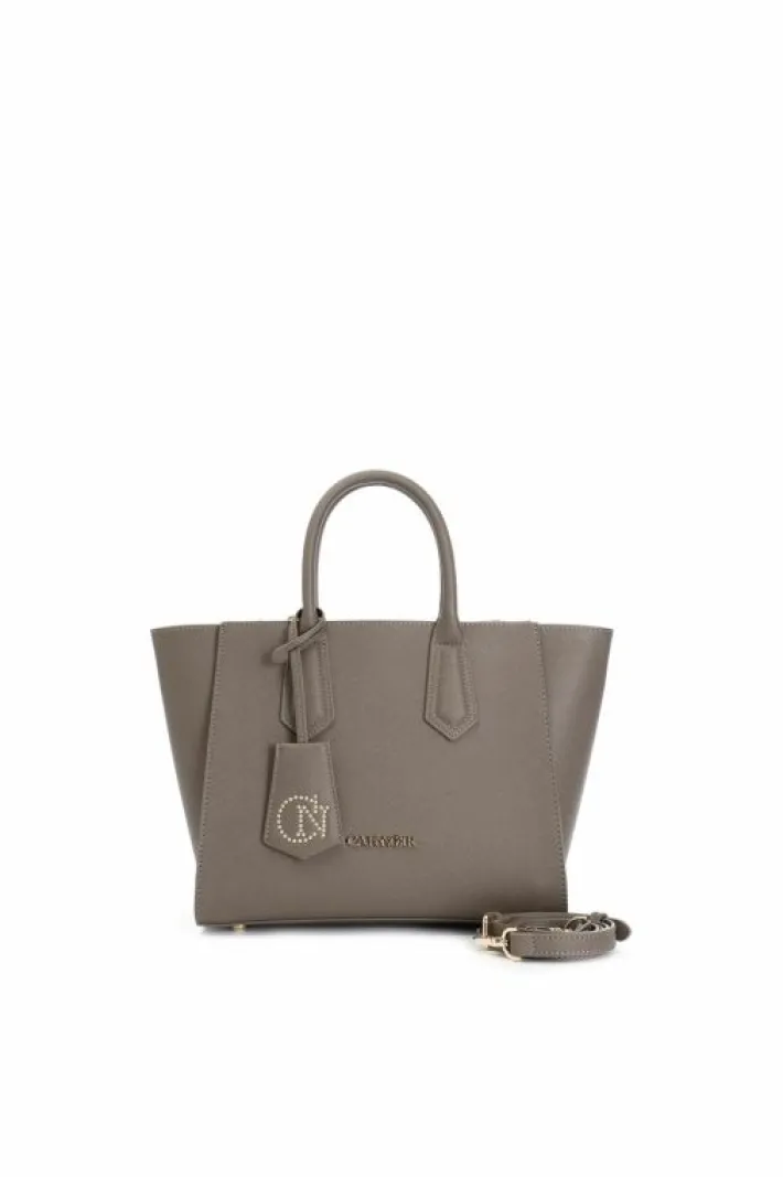 Borsa a mano dalla struttura rigida in saffiano e maxi charm con logo rivetti. chiusura con cerniera. tracolla removibile