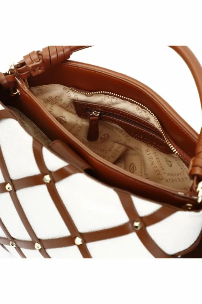 Borsa a secchiello in tessuto con intreccio effetto rete e applicazioni di borchiette dorate. charm con logo effetto cuoio. chiusura con cerniera. borsa dotata di tracolla.