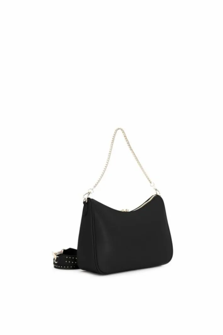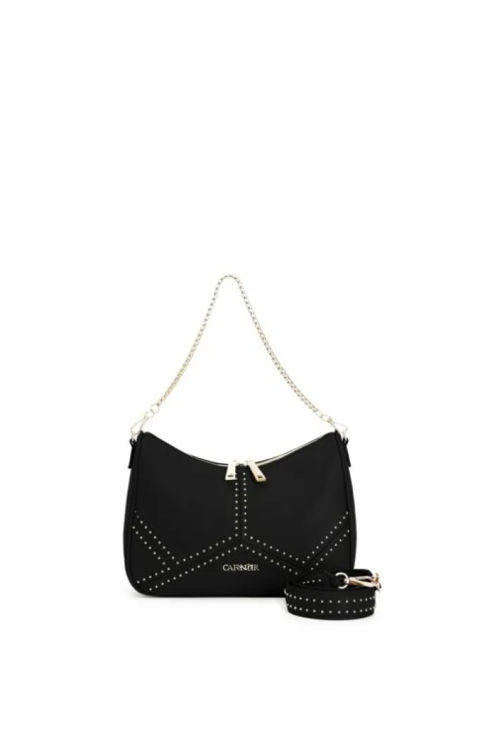 Borsa a spalla con lavorazione patchwork e applicazioni di micro rivetti. borsa divisa in vari scompartimenti: una tramezza chiusa con zip e taschino. doppia tracolla sia in catena sia nello stesso materiale della borsa.