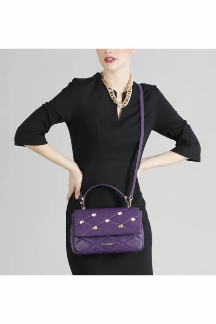Borsa media modello bandoliera con pattina trapuntata con borchie esagonali e logo ambossed. borsa provvista di unico scomparto di un taschino interno con zip di un taschino portacellulare e di una tracolla. la chiusura è con calamita.