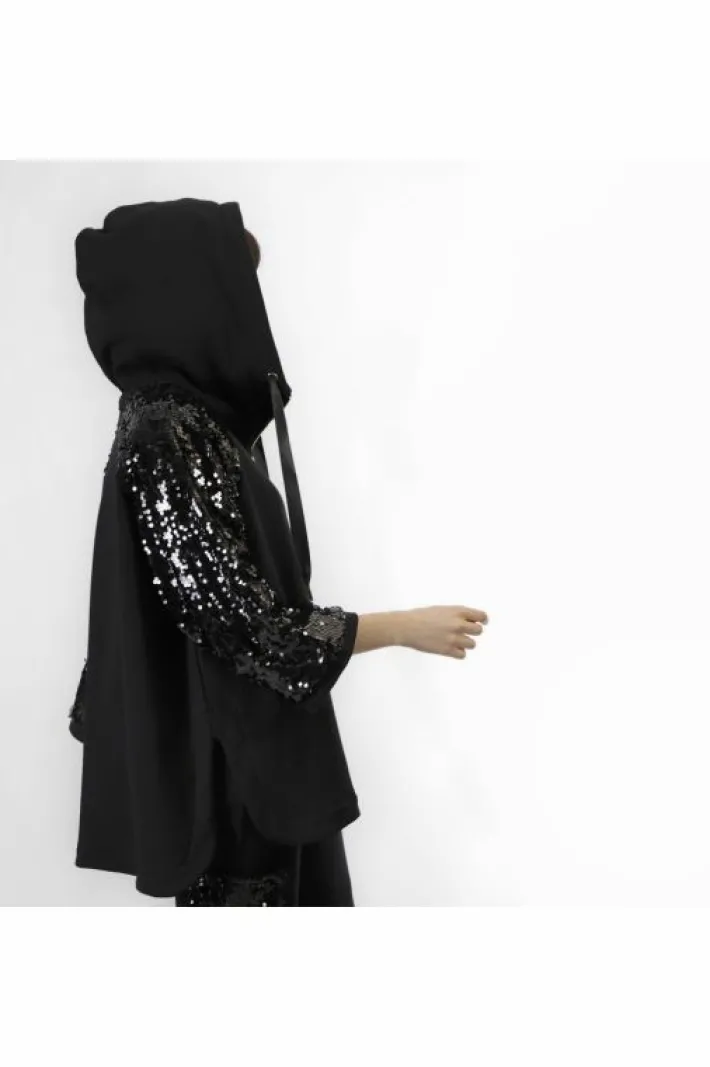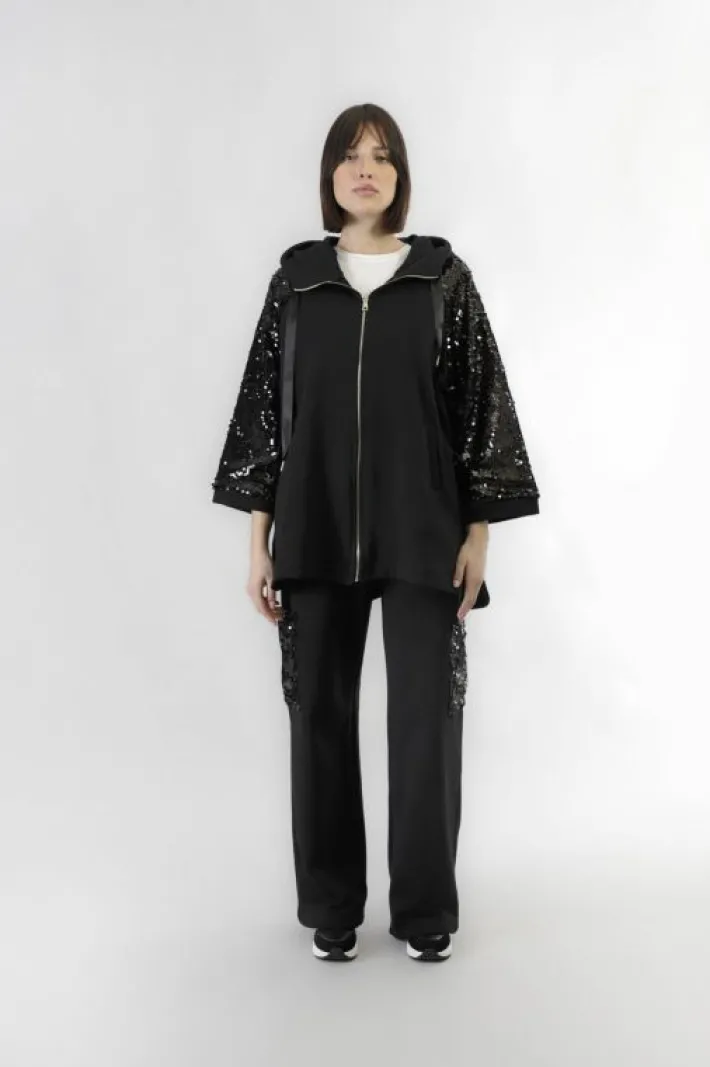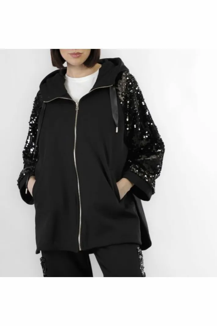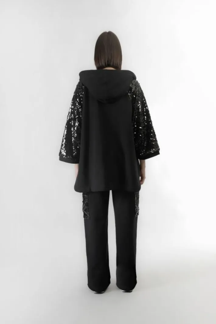 Cappa oversize con pratico cappuccio. realizzata in felpe di cotone.le maniche sono in tessuto di pailettes. questa capo è perfetto in ogni momento della giornata dal lavoro al tempo libero ideale da usare anche come capospalla nei periodi di cambio stagionale.