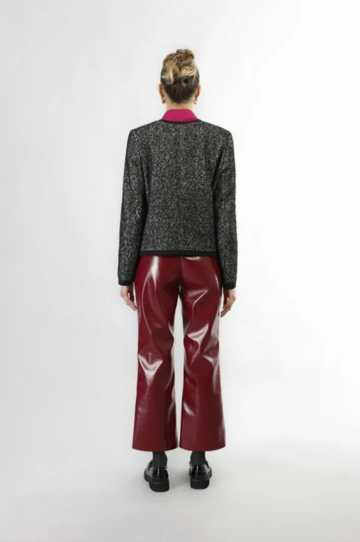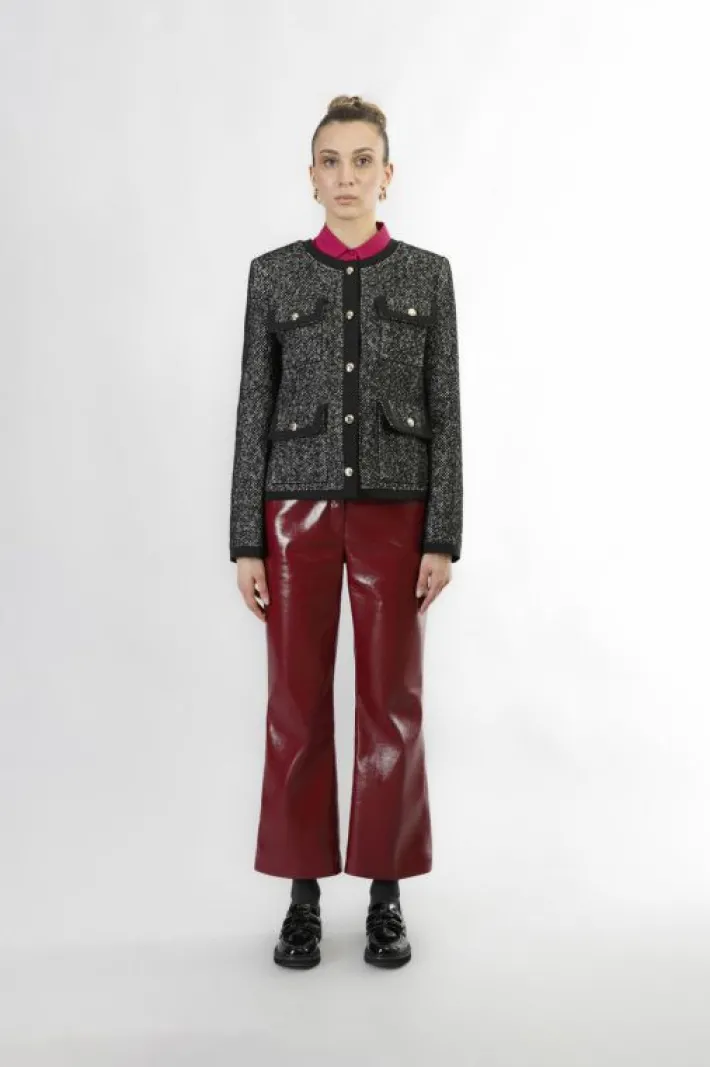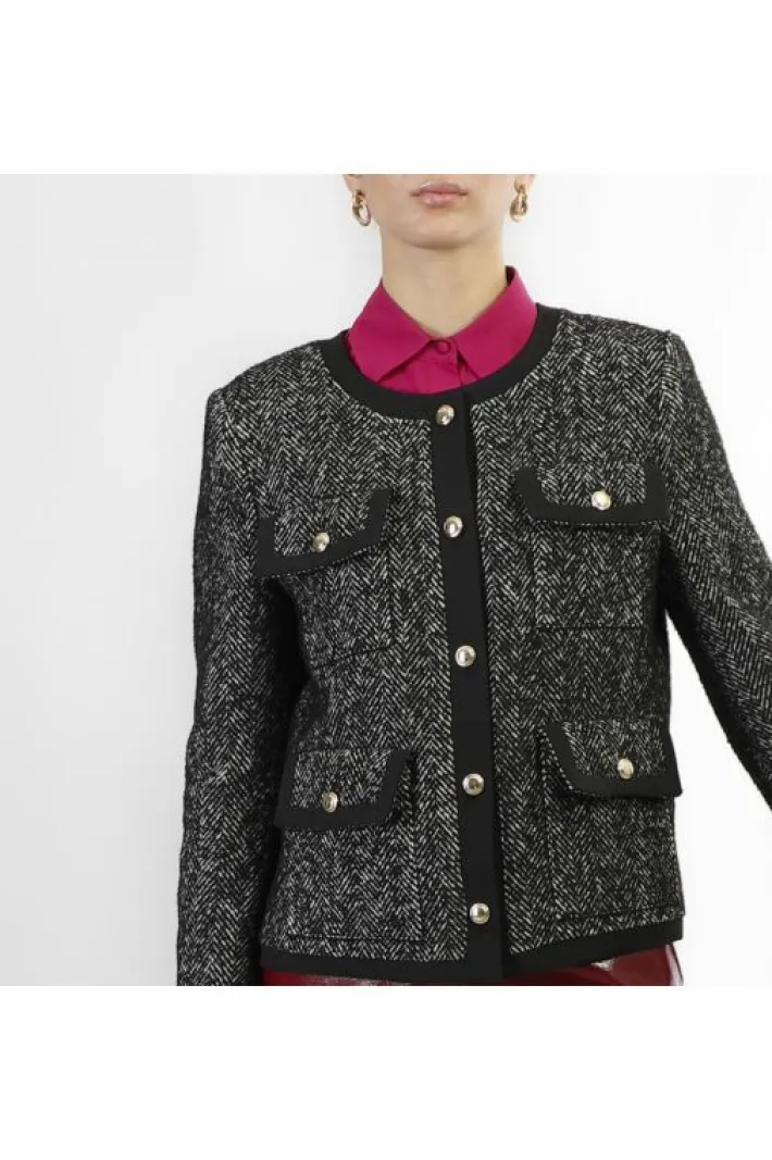 Cappotto corto monopetto e paricollo. realizzato in tessuto spigato con bordature a contrasto e bottoni oro. perfetto per un look elegante.