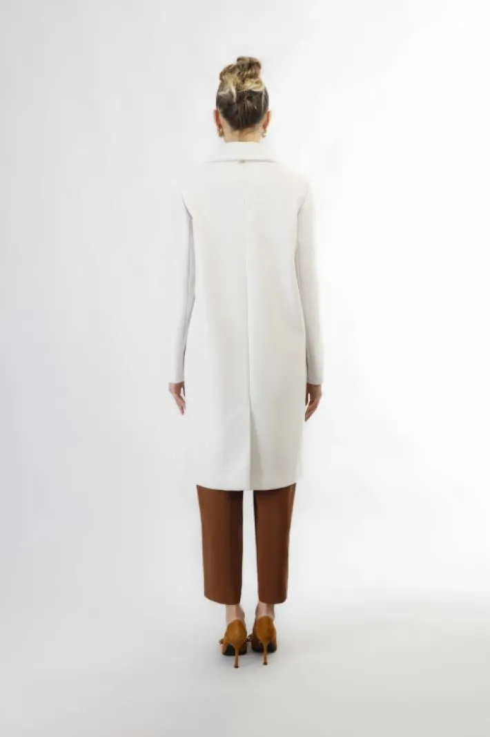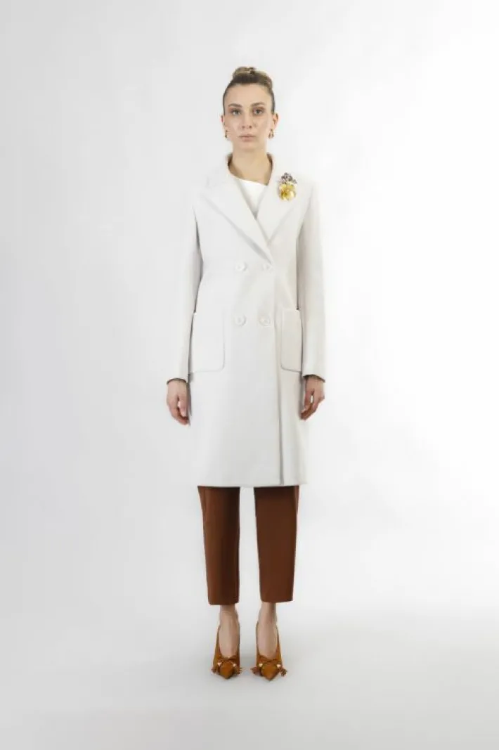 Intramontabile cappotto basico doppiopetto. il colletto è decorato da una spilla. perfetto per valorizzare in un attimo i look di tutti i giorni.
