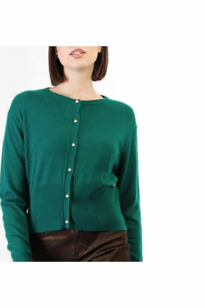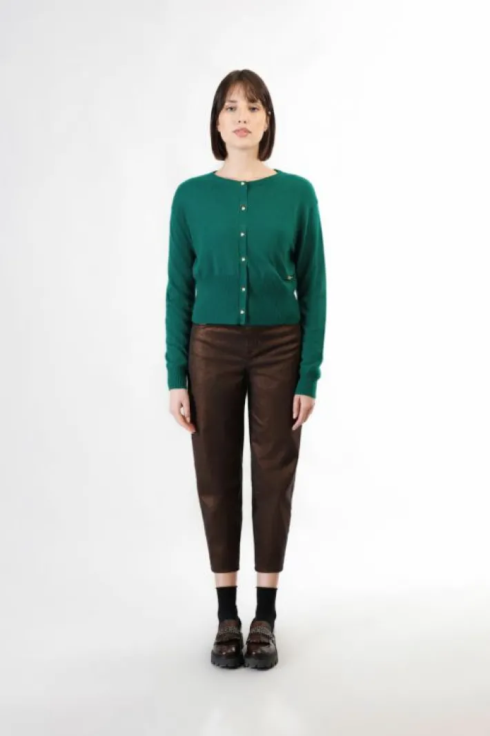 Cardigan basic girocollo realizzato in filato mistolana. chiusura con bottoni logati. capo di grande comfort e versatilità. modello passepartout per ogni tipo di esigenza.