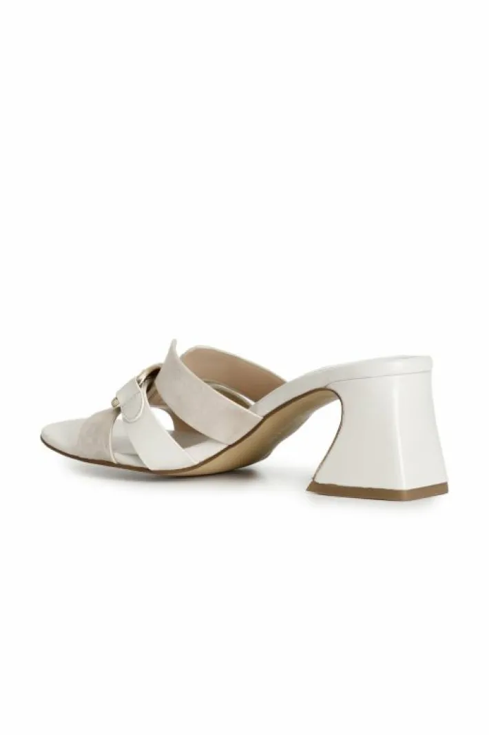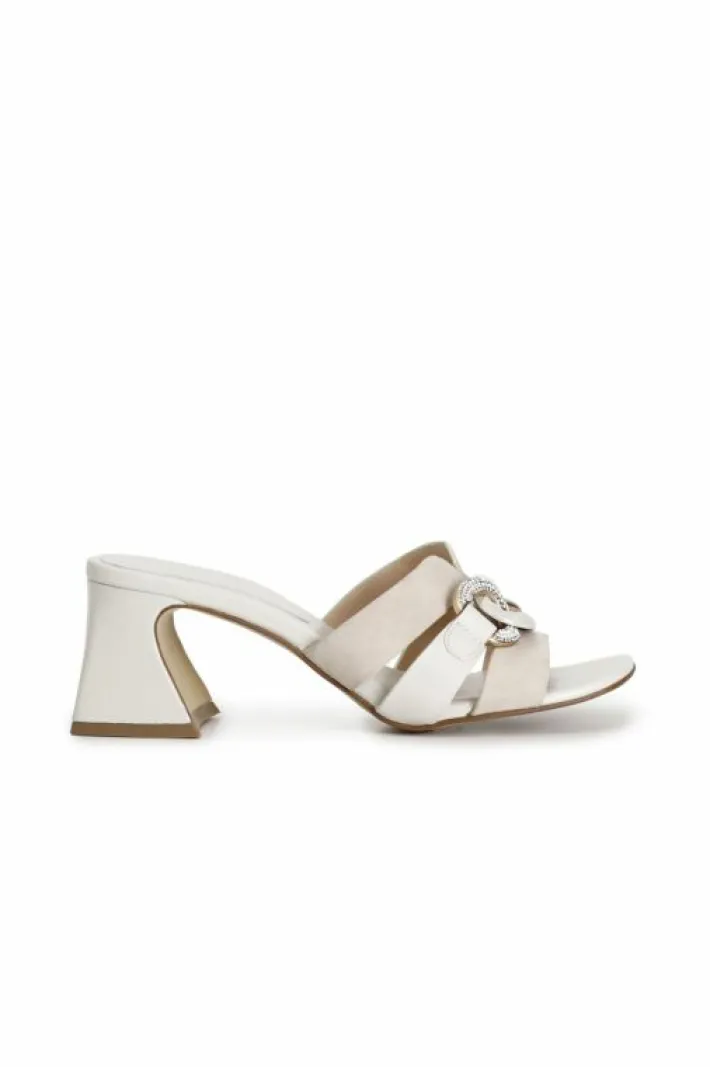 Ciabatta in camoscio e nappa arricchita da una catena gioiello. calzatura che può essere indossata tutto il giorno grazie al tacco a base larga alto 55mm e alla comoda base d’appoggio.