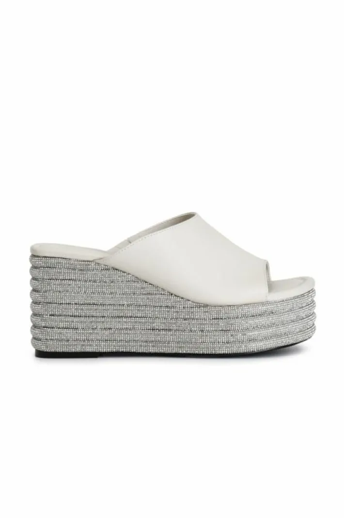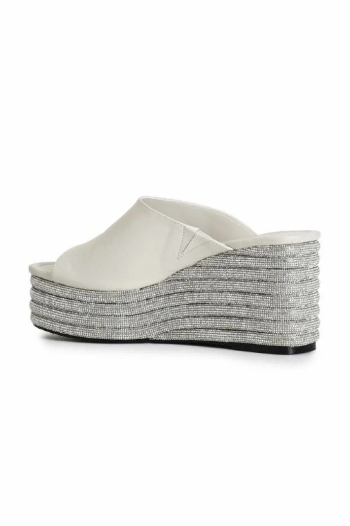 Ciabatta in nappa con zeppa caratterizzata da fasce di strass. il comodo soletto imbottito in vera pelle fa risultare la calzatura comoda anche dopo svariate ore di utilizzo. il tacco è alto 70mm il plateau invece è di 35mm.