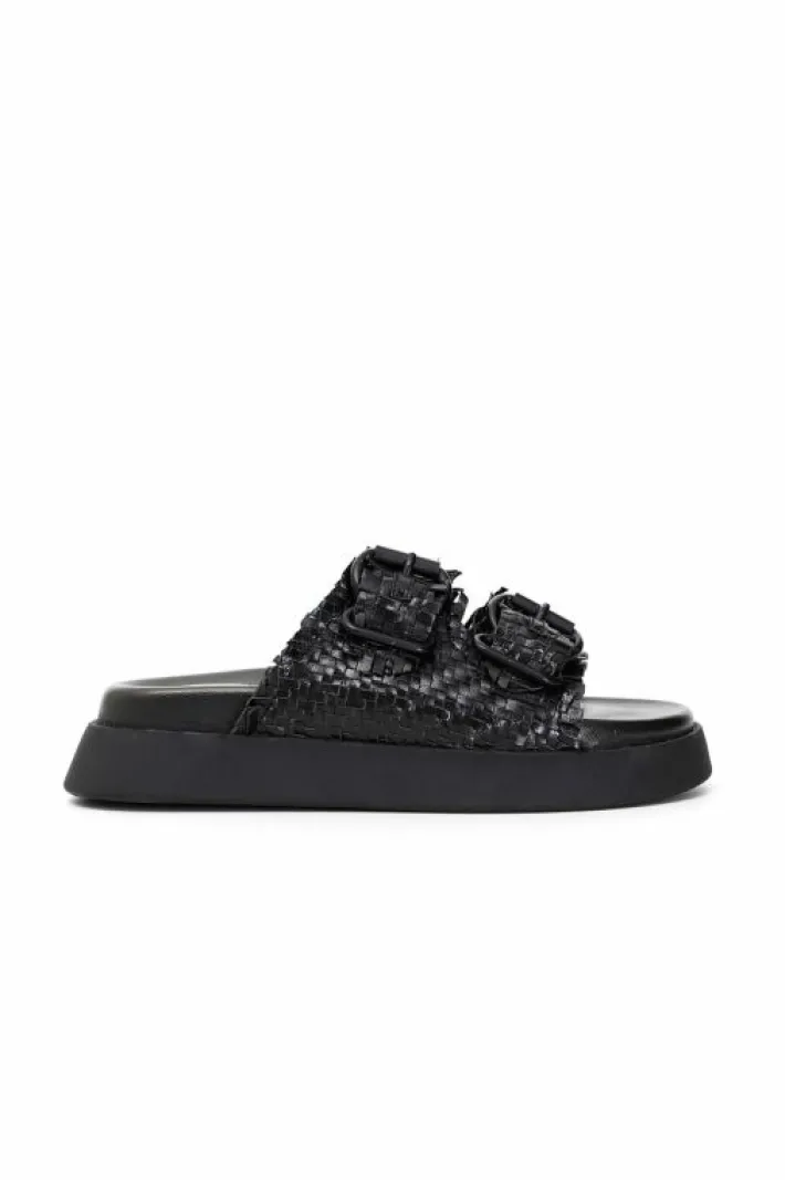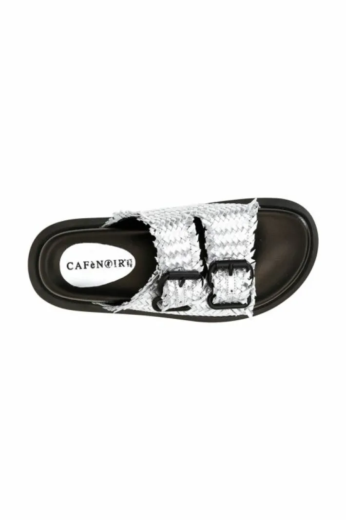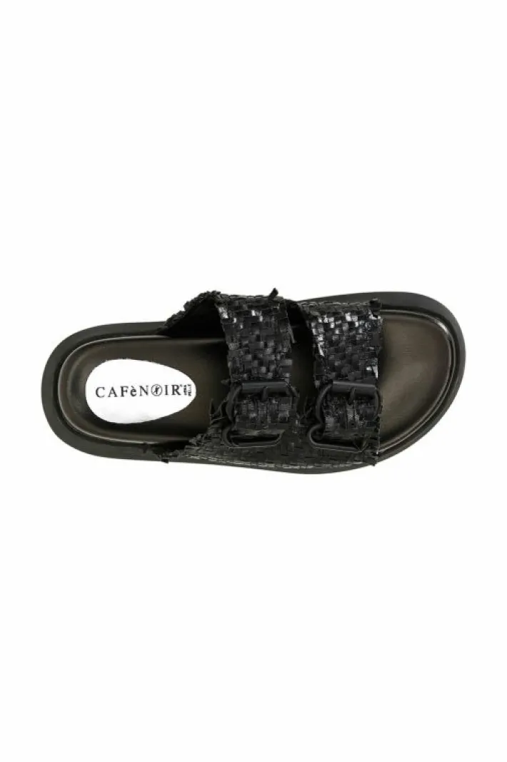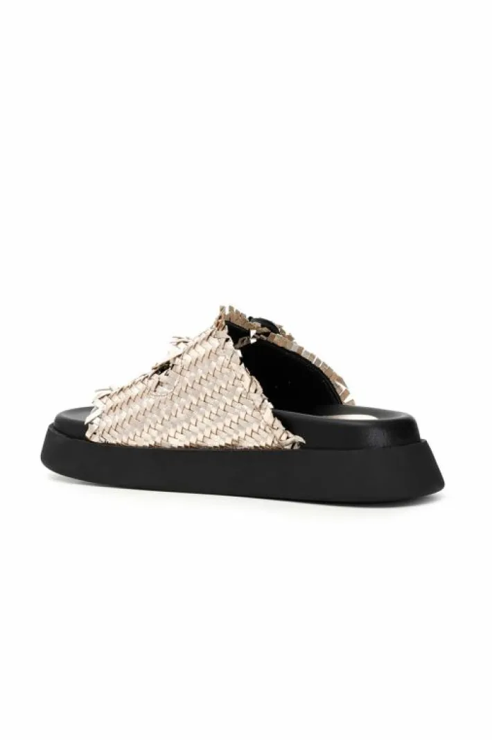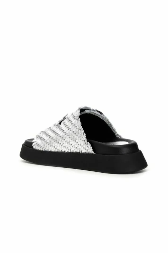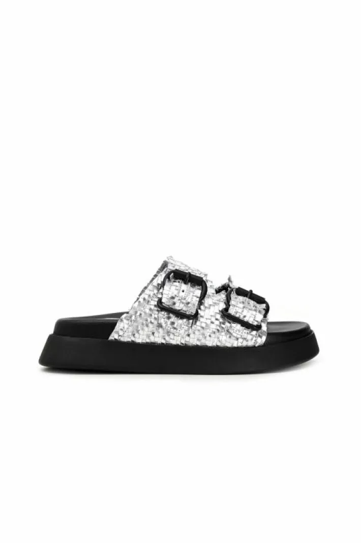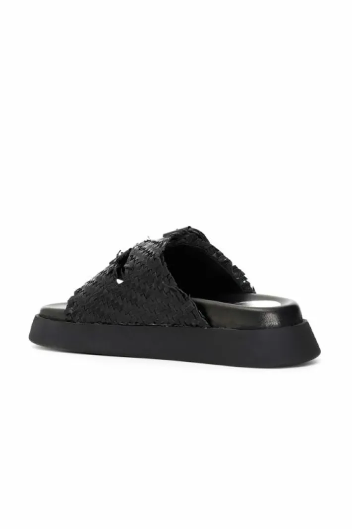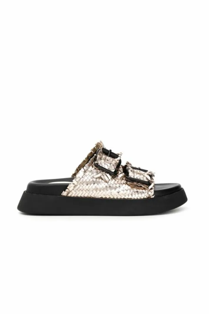 Ciabatte con doppia fibbia in pelle intrecciata dai bordi leggermente sfrangiati. Comodo footbed e suola alta in micro.