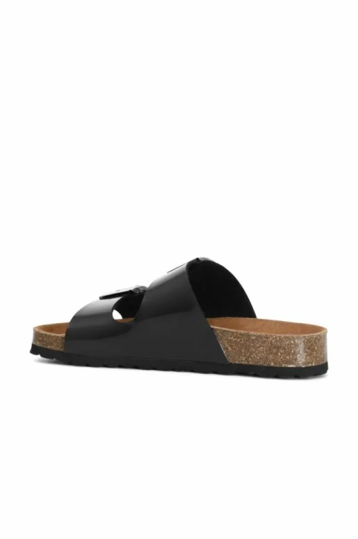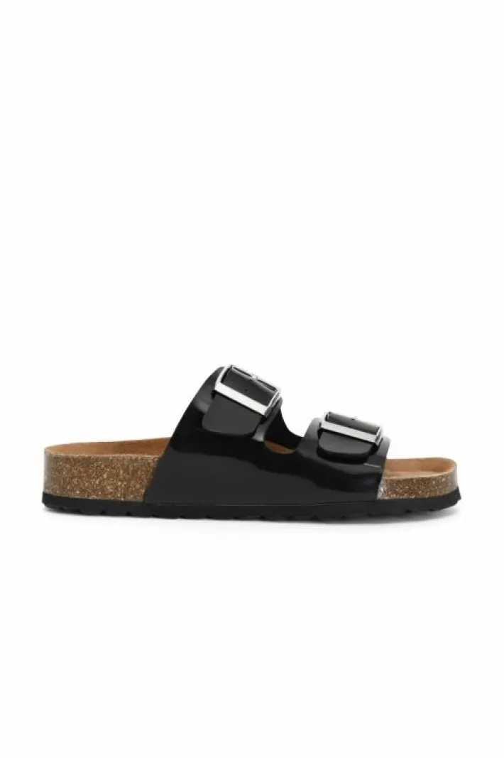 Ciabatte due fasce in vernice con fibbia su footbed.