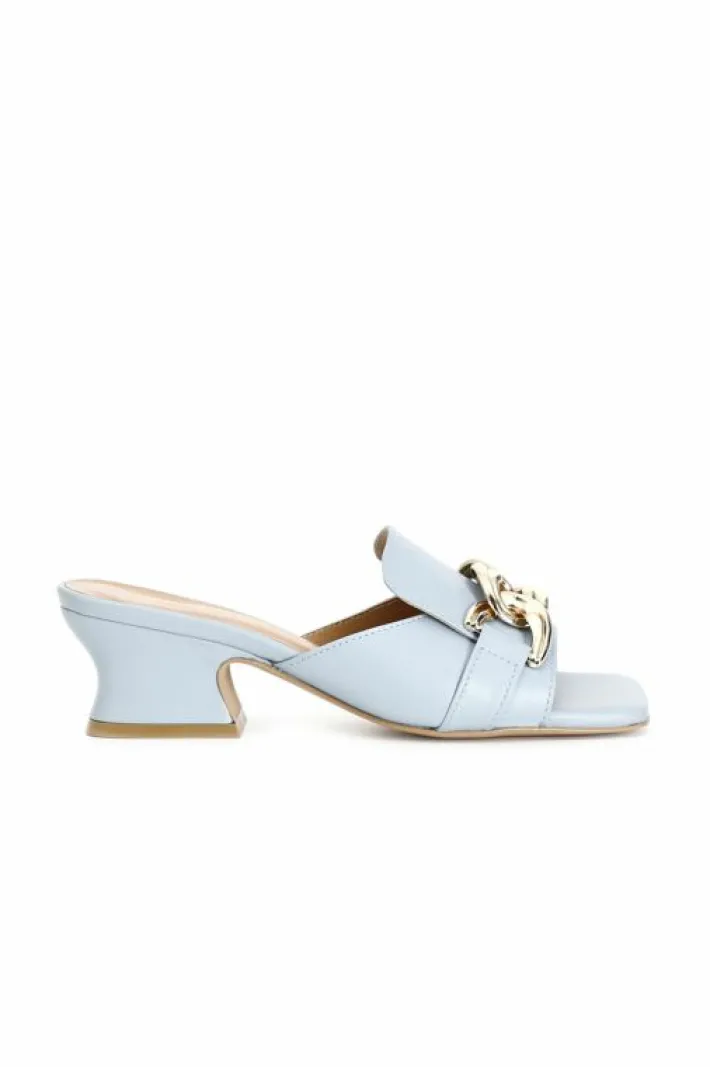 Ciabatta in pelle con accessorio catena dorata e tacco a rocchetto bold.