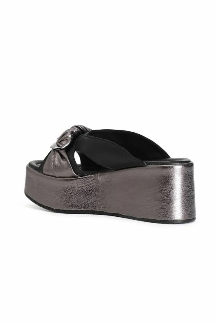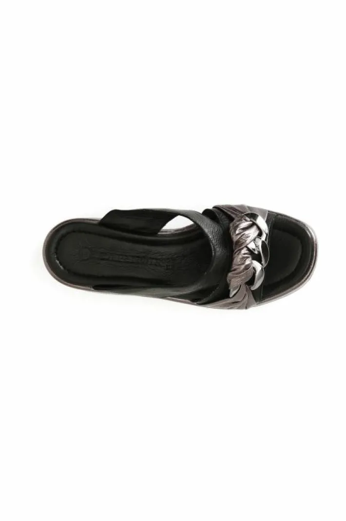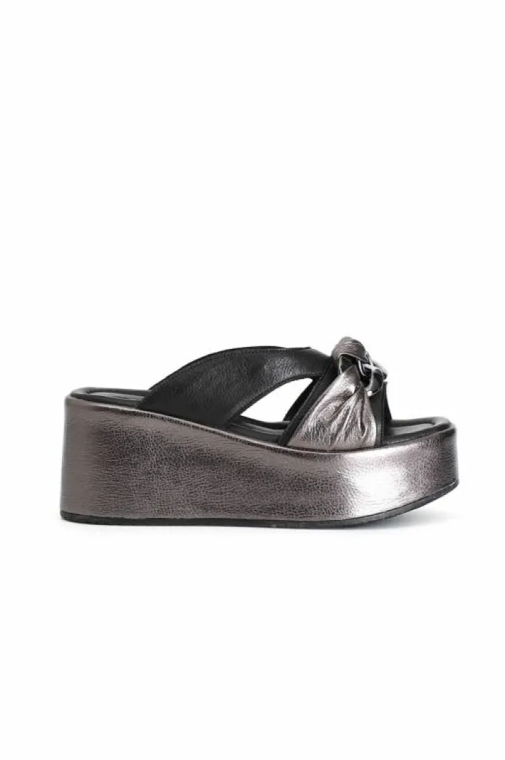 Ciabatte laminate in pelle bicolor su zeppa con accessorio catena.