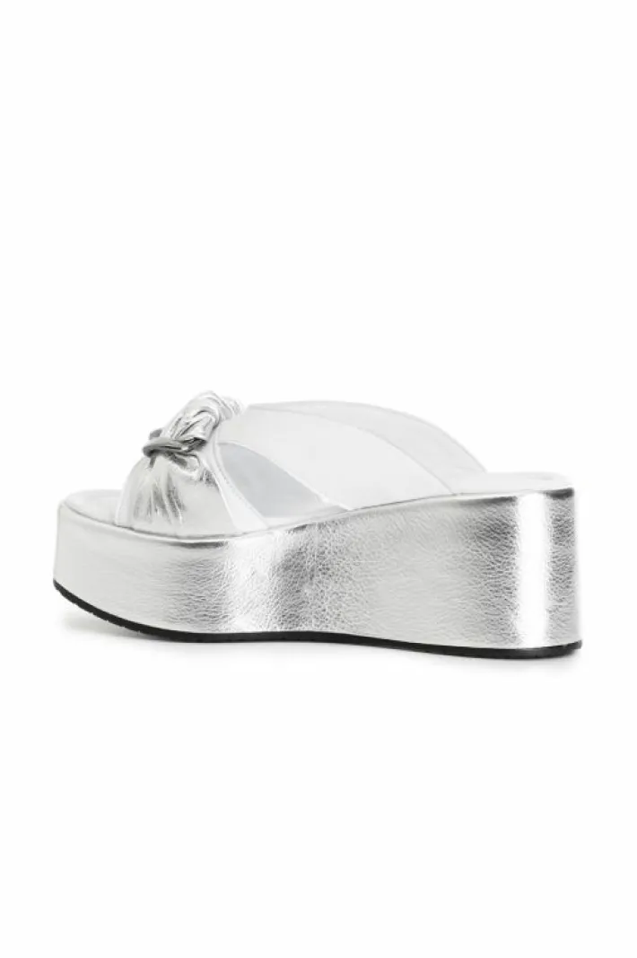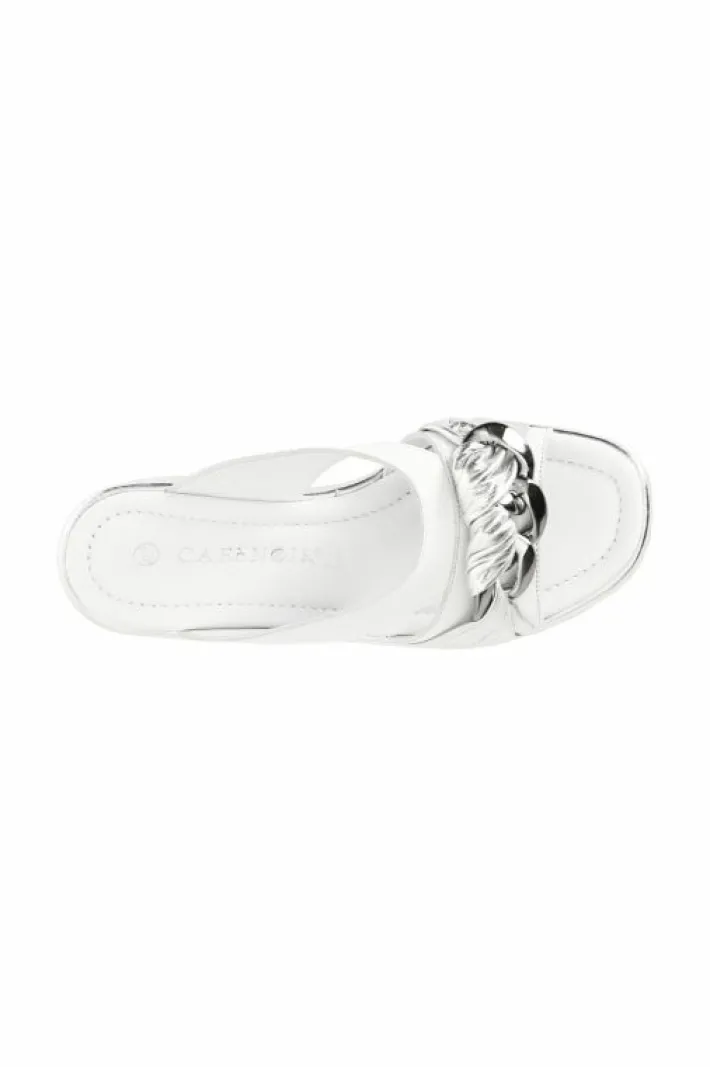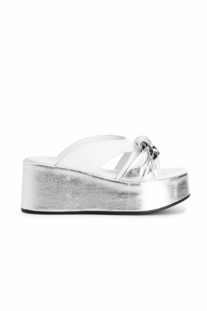 Ciabatte laminate in pelle bicolor su zeppa con accessorio catena.