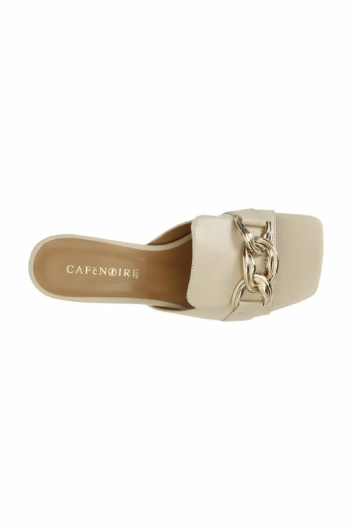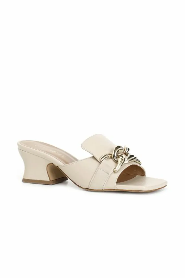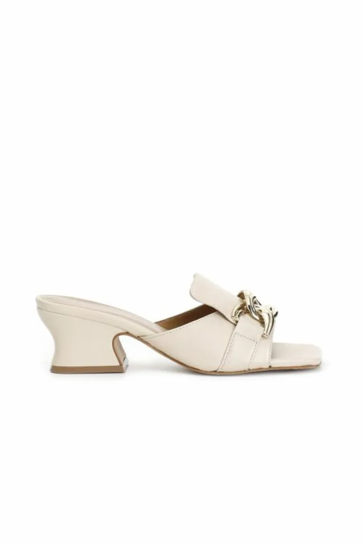 Ciabatta in pelle con accessorio catena dorata e tacco a rocchetto bold.