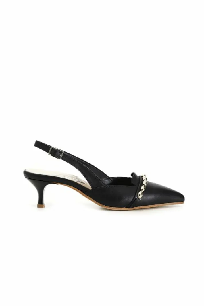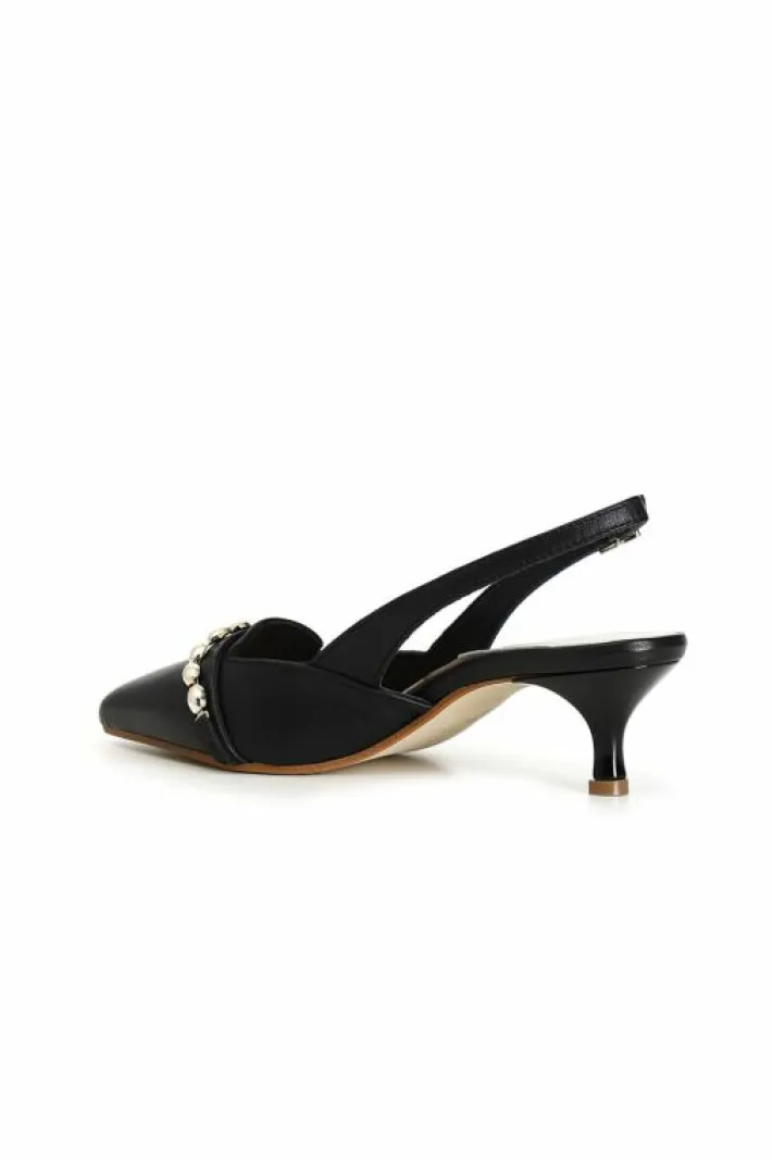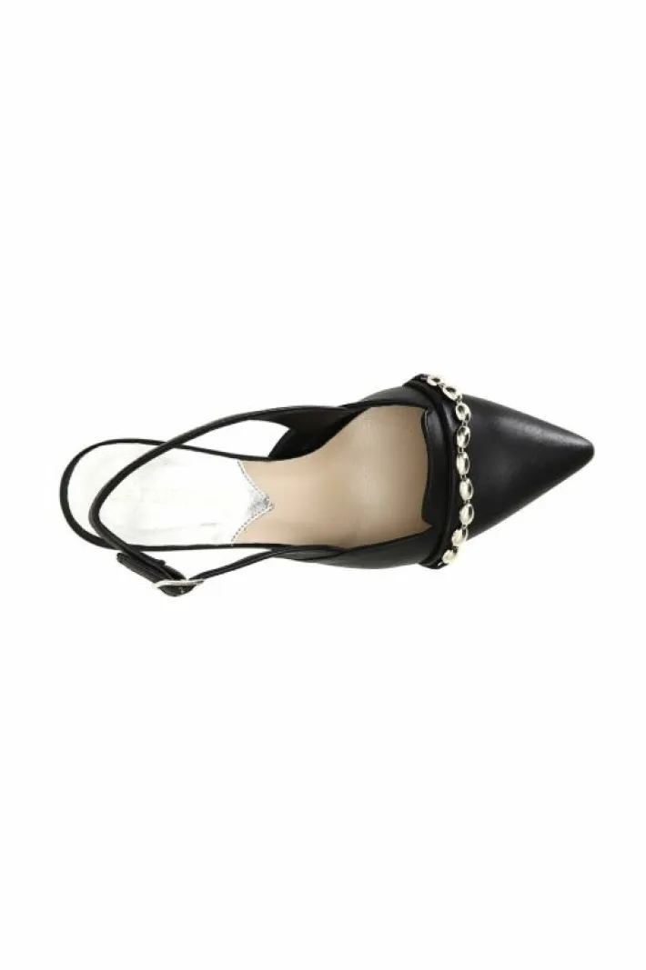 Dècollète color block con inserto gioiello a catena sul davanti. fibbia e tacchetto medio.