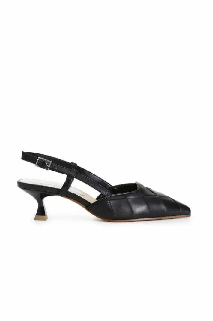 Elegante décolleté in pelle intrecciata con cinturino sul retro. forma sfilata. tacco a rocchetto alto 45mm. calzatura alla moda ma indossabile anche nel quotidiano per soddisfare le esigenze di uno stile di vita dinamico.