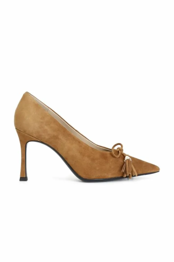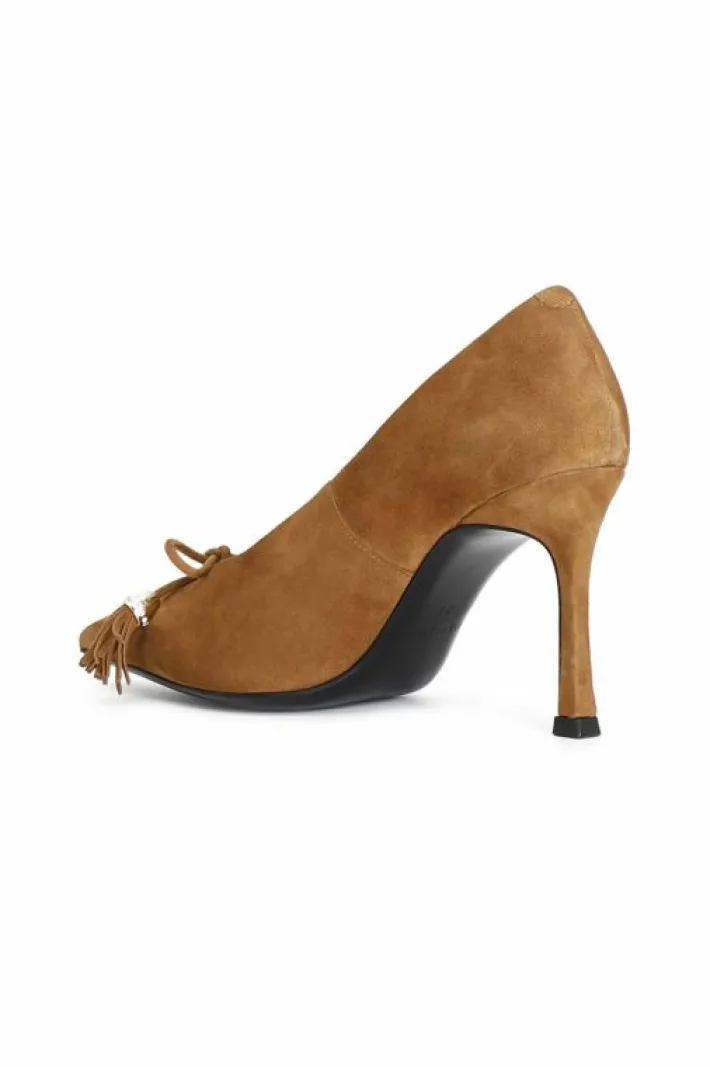Décolleté in camoscio con nappine. tacco fine alto 87 mm. forma sfilata. fodera e soletto sono in pelle. calzatura dallo stile elegante e femminile.