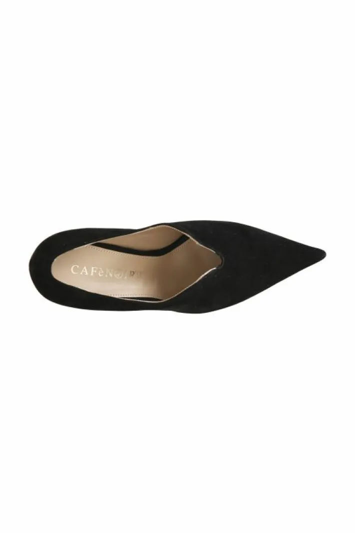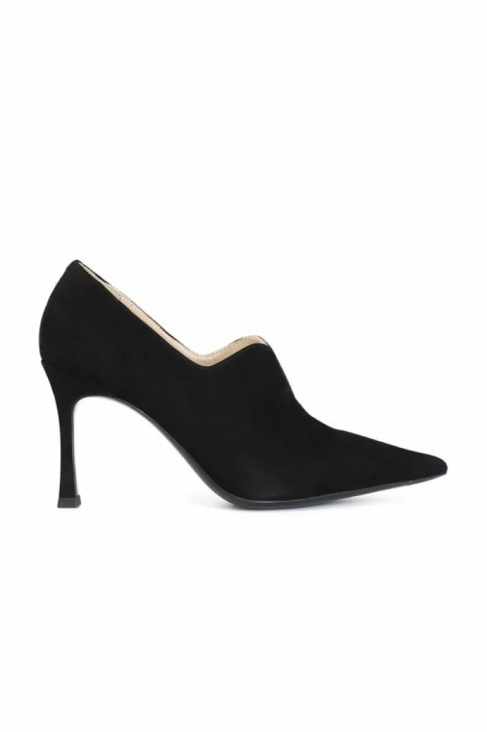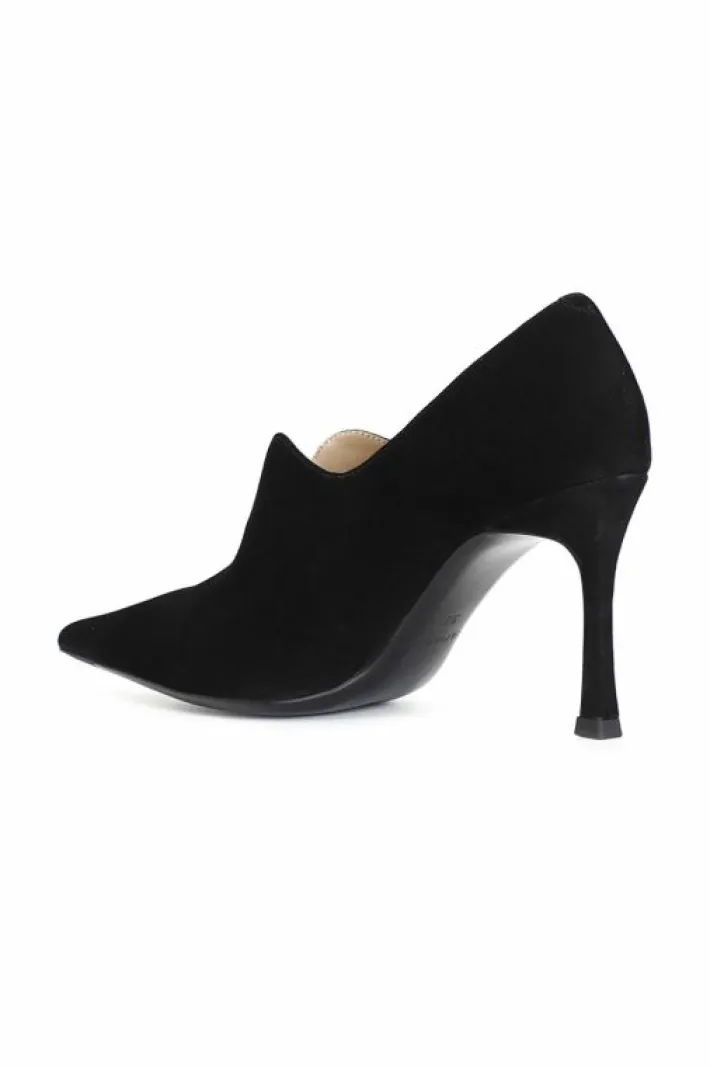 Décolleté in camoscio con taglio a “v”. tacco fine alto 87 mm. forma sfilata. fodera e soletto sono in pelle. calzatura dallo stile elegante e femminile.