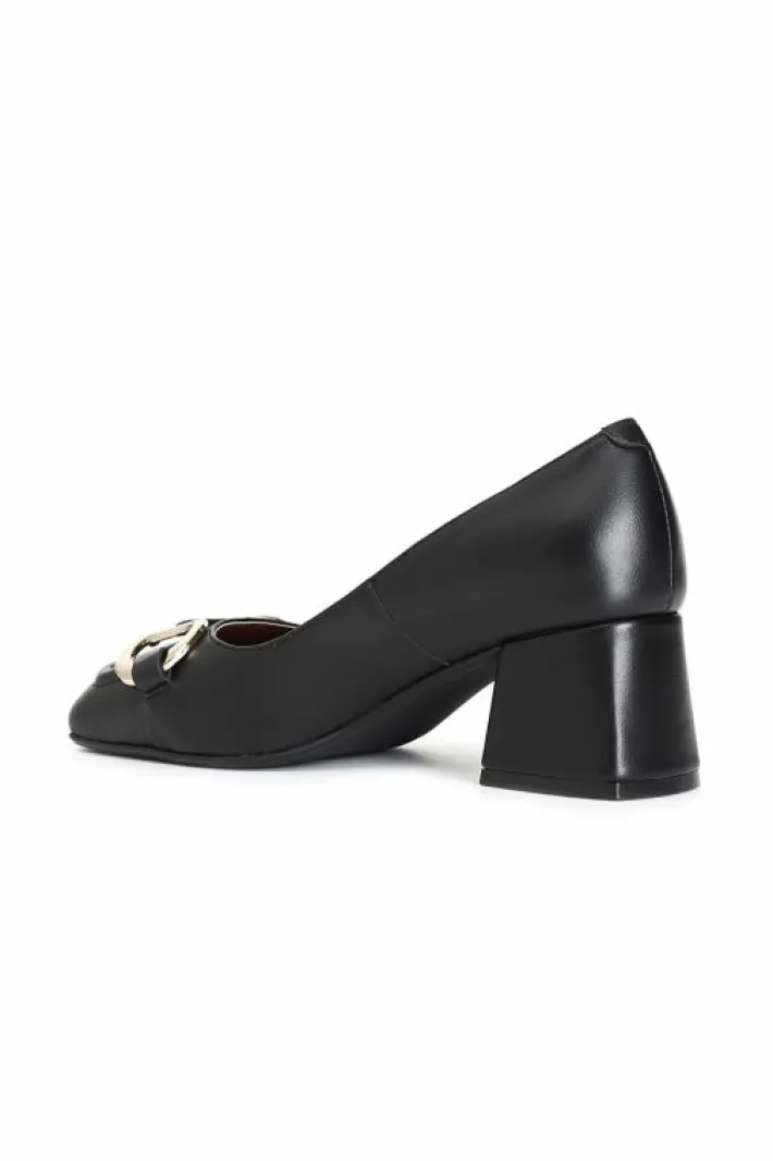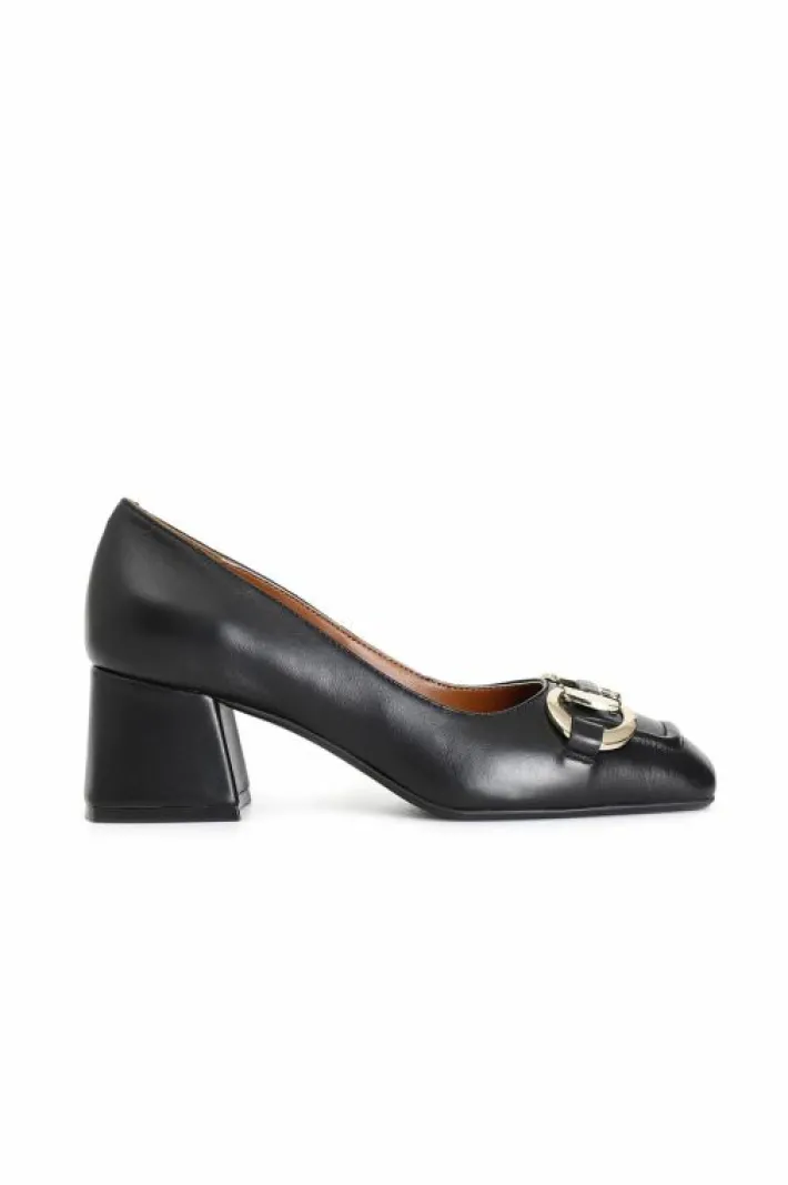 Décolleté in pelle con morsetto. tacco spesso alto 60 mm. il soletto è in pelle.