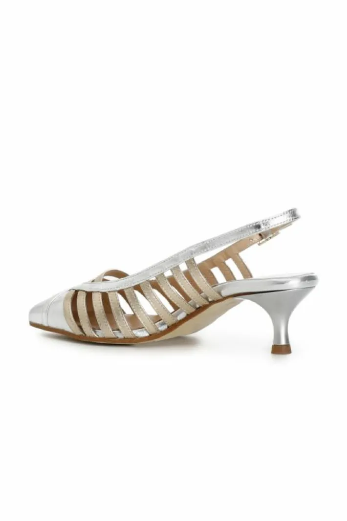 Dècollète in pelle laminata con un gioco di fasce laterali realizzate con una sfumature di colore più scuro ma in tono. Fibbia sul retro e tacchetto medio.