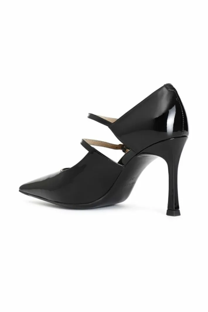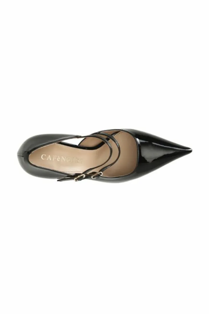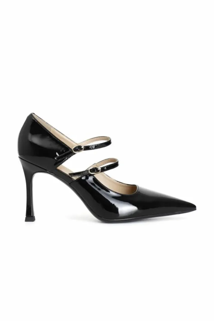 Décolleté in vernice dallo stile elegante e femminile. calzatura arricchita da doppio cinturino e fibbia. tacco fine alto 87 mm. forma sfilata. fodera e soletto sono in pelle.