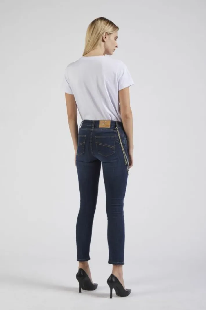 Jeans in tela denim super stretch dalla vestibilità skinny. arricchisce il capo una ricercata catena gioiello personalizzata.