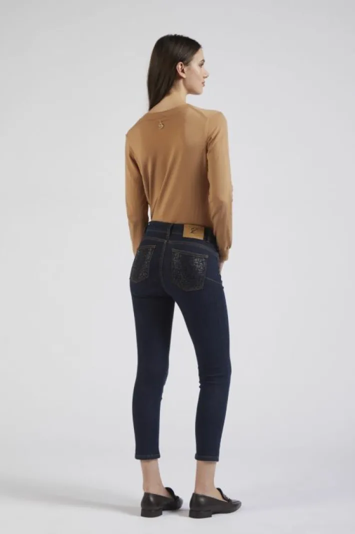 Jeans in tela denim super stretch dalla vestibilità skinny. applicazione di strass sulle tasche posteriori.