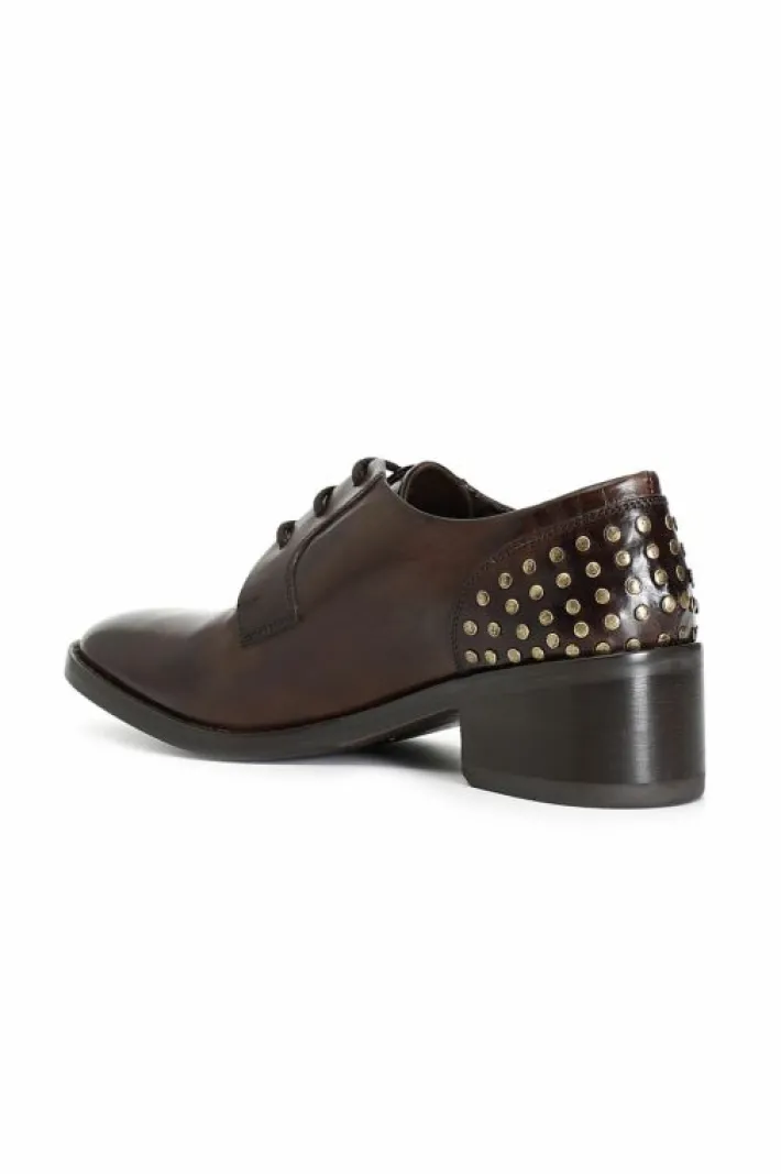 Scarpa derby da donna allacciata. la tomaia è in pelle ed è arricchita da borchie sul toppone. altezza tacco 50mm. il soletto è in pelle