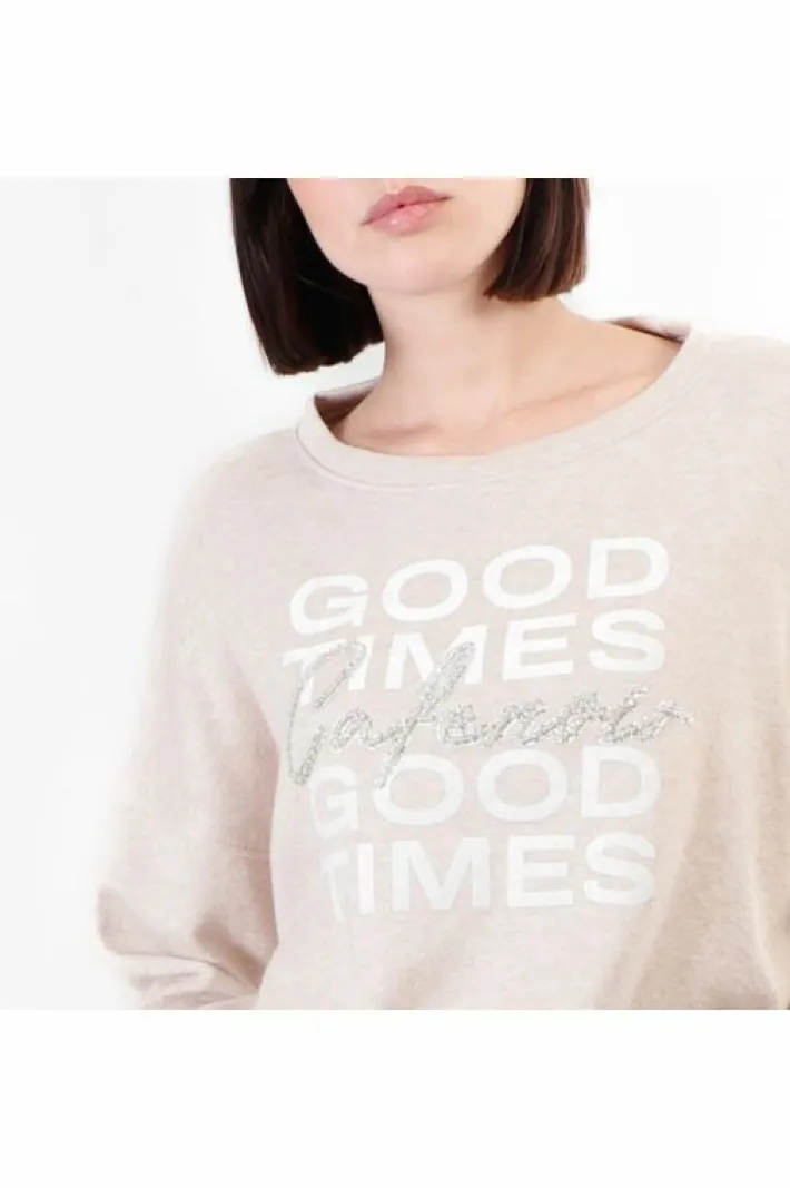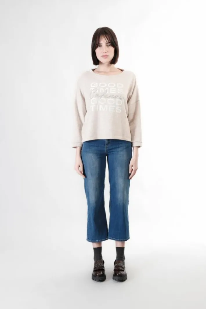 Felpa over dalla mano calda con scollo a barca e manica a pipistrello. stampa floccata e ricco ricamo a mano. capo estre…