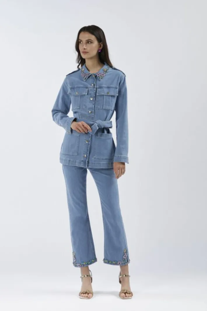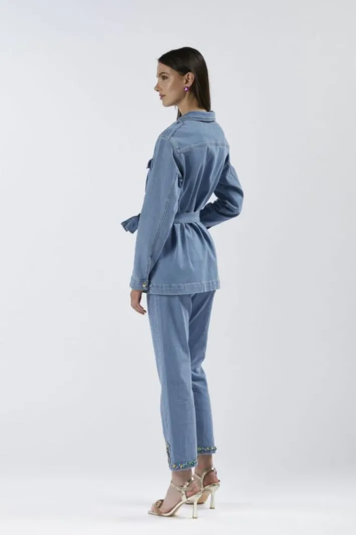 Field jacket realizzato in denim comfort. il colletto è impreziosito da un ricco ricamo esclusivo di strass multicolor. maniche lunghe