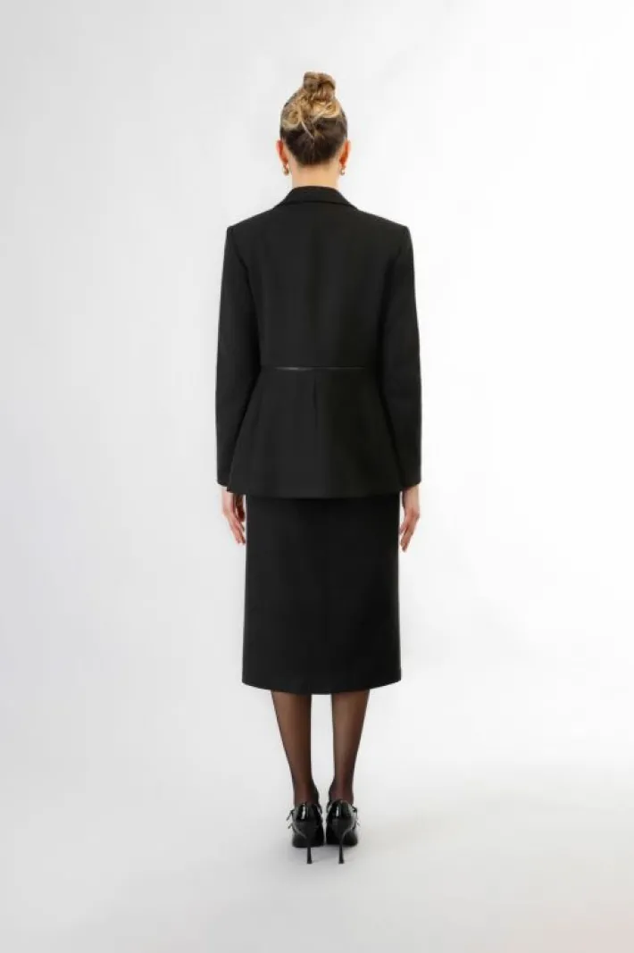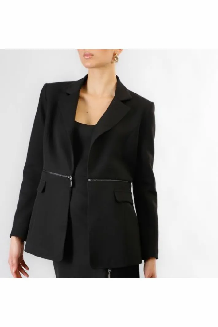 Giacca monopetto senza abbottonatura realizzato in tessuto poliviscosa. grazie alla presenza di una zip funzionale applicata in vita la giacca si può trasformare in un simpatico bolerino.