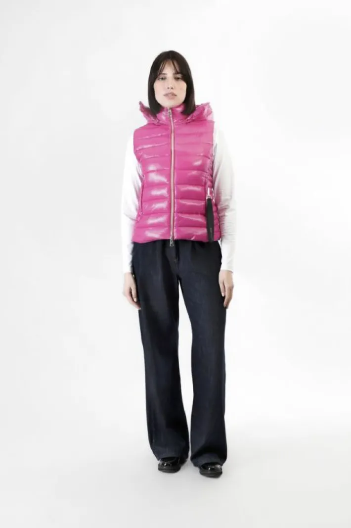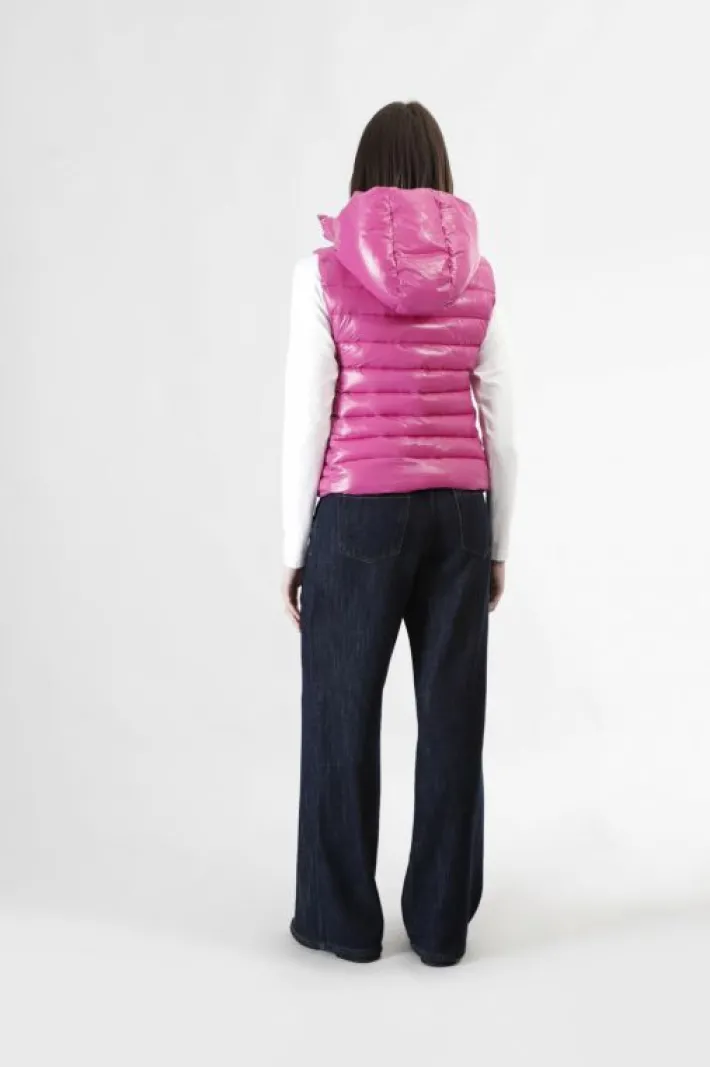Gilet corto dalla forma essenziale realizzato in nylon ultralight dalla finitura lucida. il capo presenta un cappuccio removibile. capo perfetto per attacco stagione.