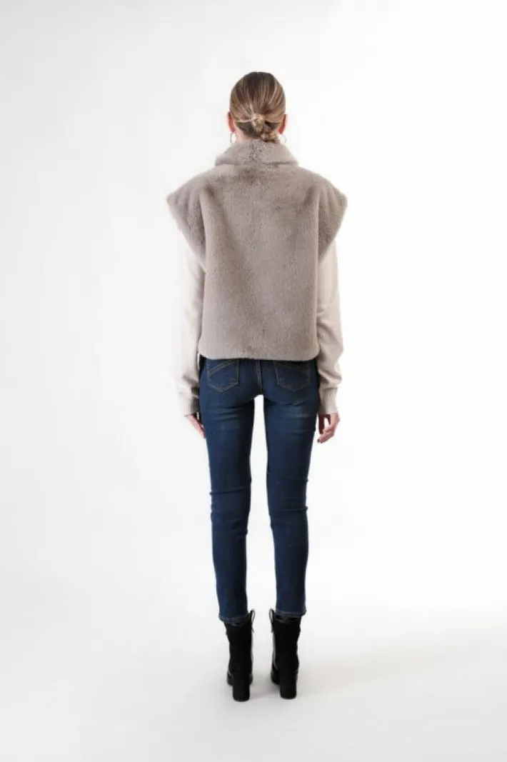 Gilet cropped con spalla scesa realizzato in una soffice similpelliccia tipo rabbit. chiusura con cerniera. capo ideale per creare sovrapposizioni