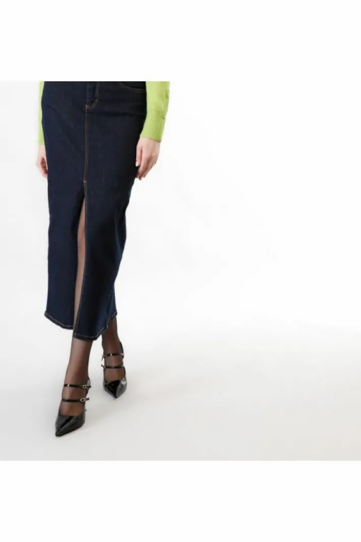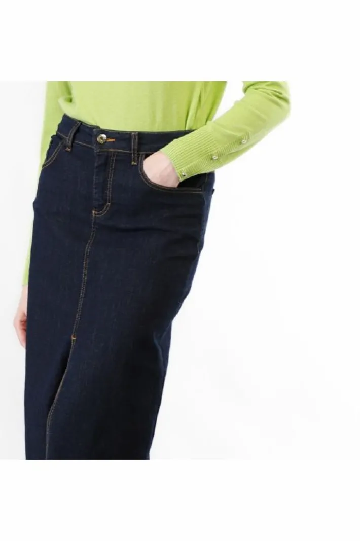 Gonna lunga in denim con spacco frontale. chiusura anteriore con zip e bottone. key look: gonna lunga con un maglione xxl dalle maniche extra.