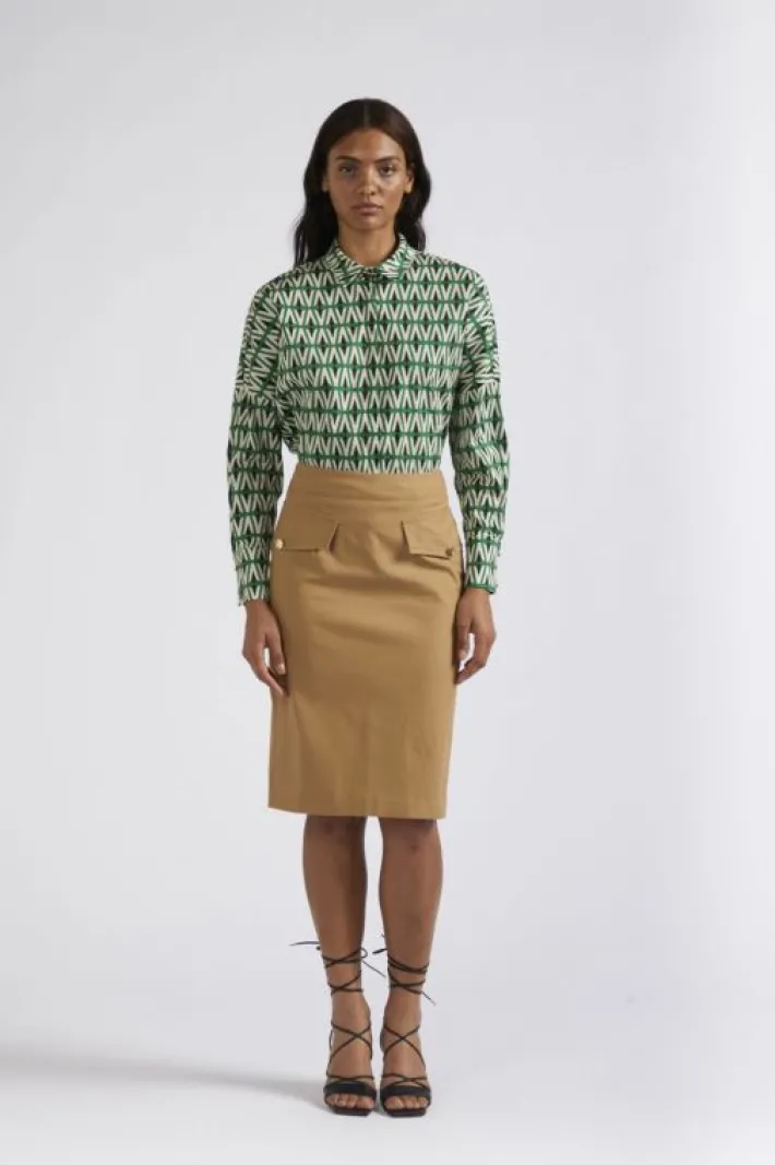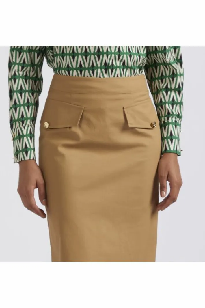 Gonna al ginocchio con tasche a pattina realizzata in cotone elastico. semplice elegante moderna porta raffinatezza al tuo guardaroba di tutti i giorni.