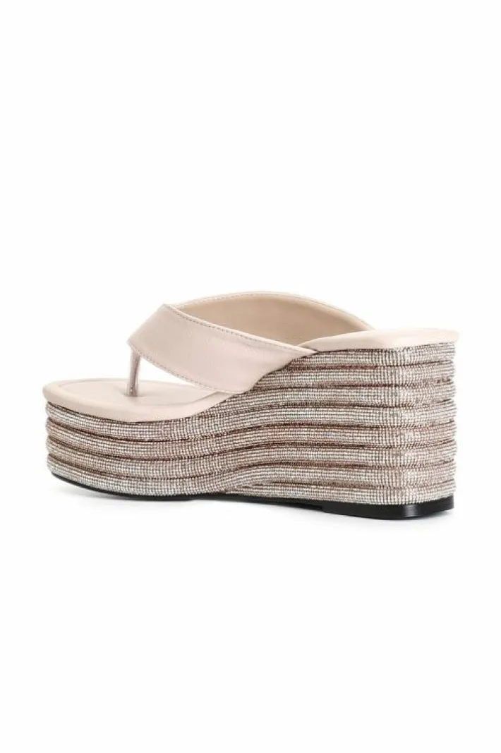 Infradito in nappa con zeppa caratterizzata da fasce di strass. il comodo soletto imbottito in vera pelle fa risultare la calzatura comoda anche dopo svariate ore di utilizzo. il tacco è alto 70mm il plateau invece è di 35mm.