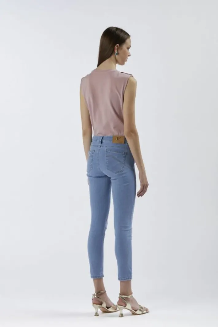 Jeans cinque tasche in tela denim superstretch. catena gioiello alle tasche davanti. vestibilità skinny