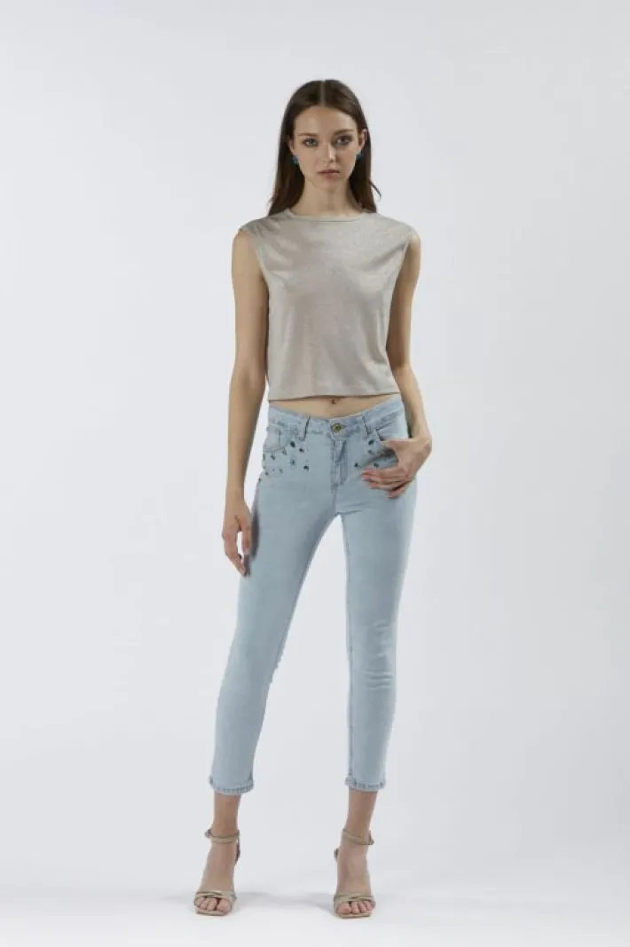Jeans dalla vestibilità skinny in denim comfort. applicazione di strass multicolor a decorare le tasche davanti.