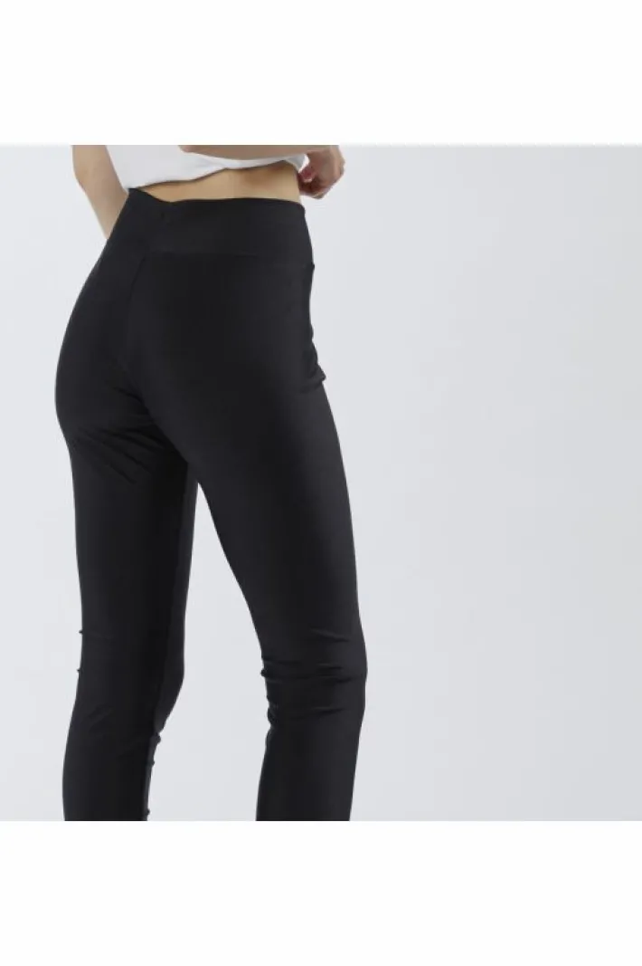 Leggings in tessuto elastico della finitura lucida. questo modello senza tasche ha la vita elasticizzata. estremamente compatto e non trasparente segue perfettamente le linee del corpo modellando le forme con fascino ed eleganza senza costringere.
