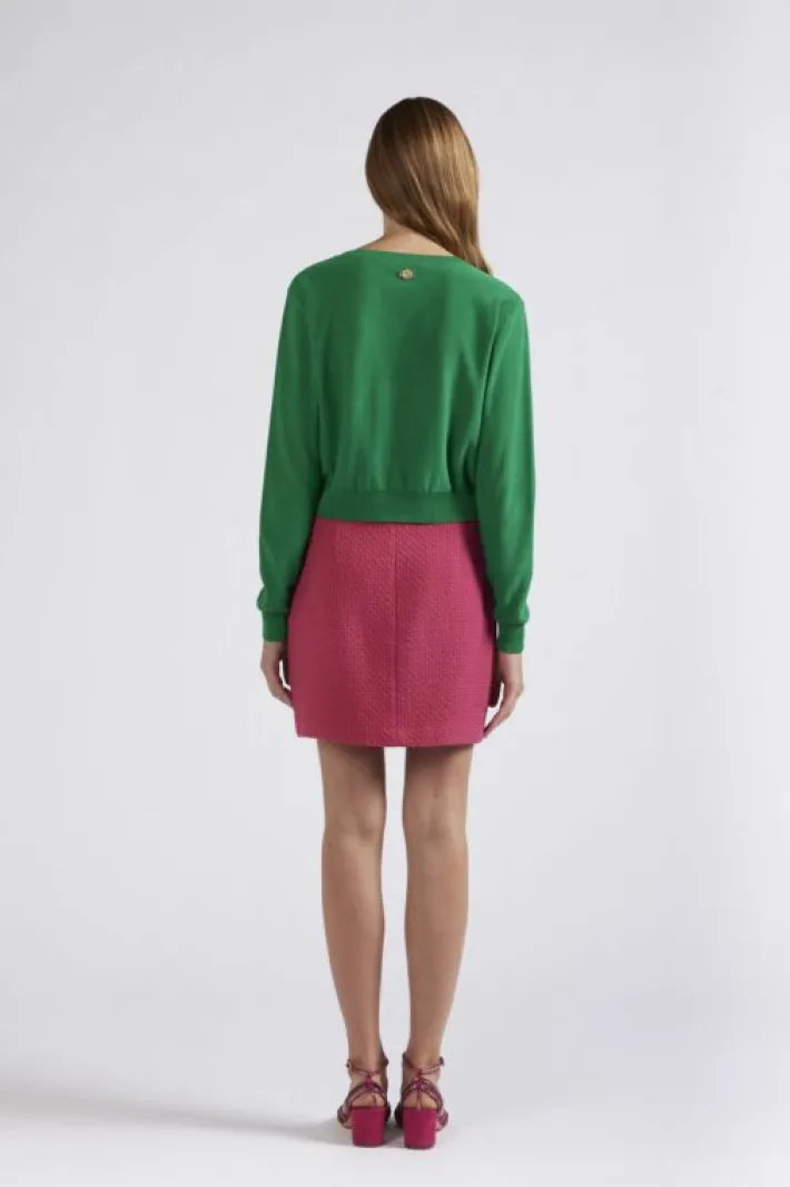 Maglia girocollo a maniche lunghe. capo realizzato in filato misto cotone e viscosa. applicazione di fiori crochet sul davanti.