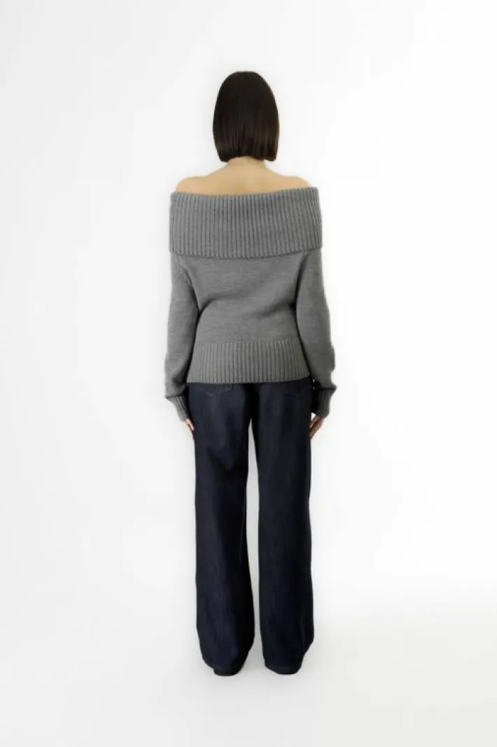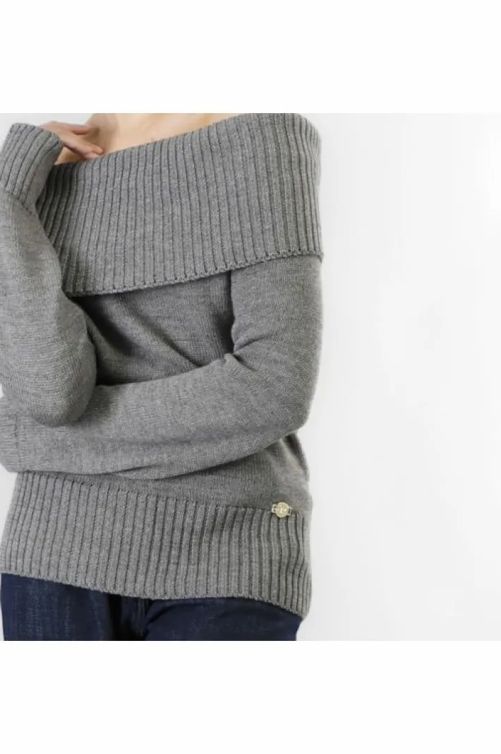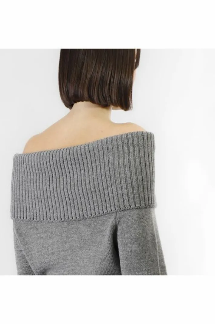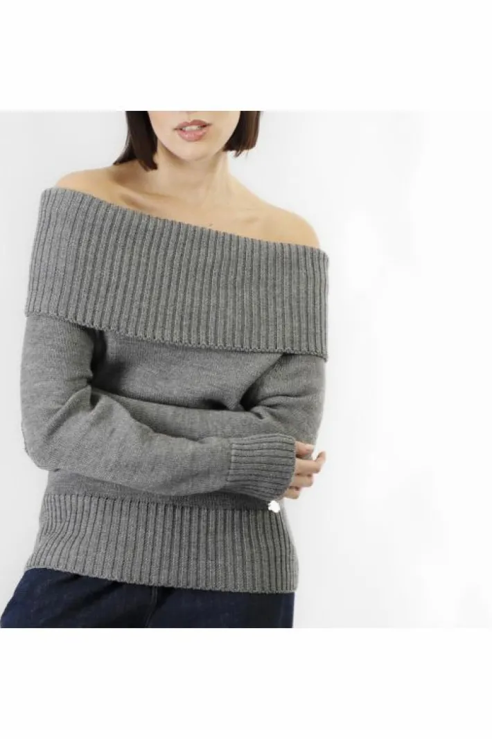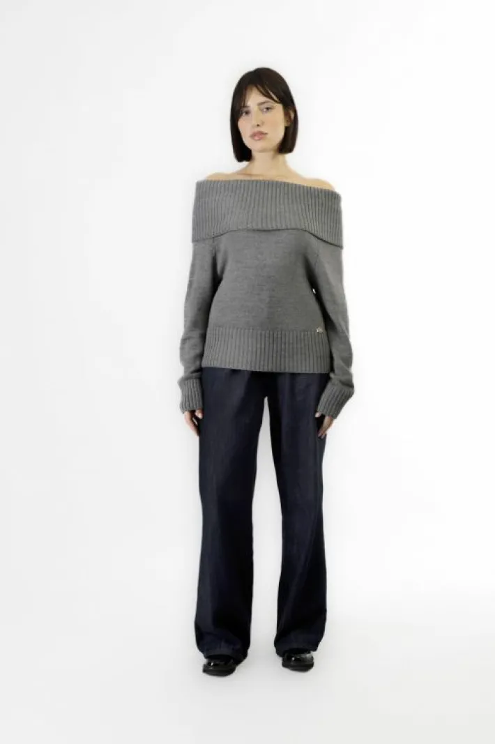 Maglia in misto lana con scollatura a barca risvolatato che lascia le spalle scoperte. capo dal tocco casual e moderno. perfetto da indossare tutti i giorni.