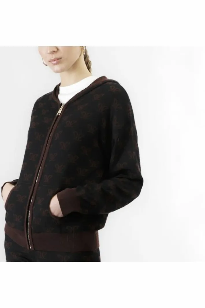 Maglia con zip e cappuccio n caldo e morbido filato mistolana. punto maglia rasato con lavorazione logo jacquard. capo perfetto che aggiunge un tocco di stile al tuo guardaroba invernale.