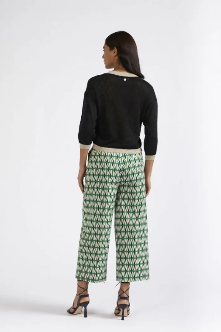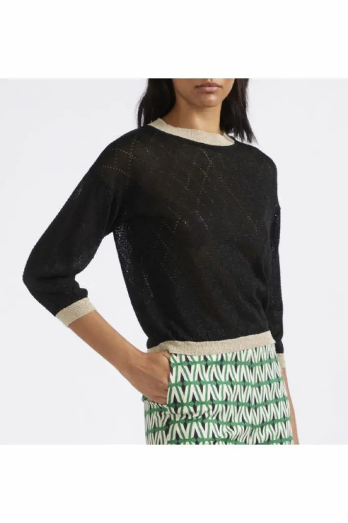 Maglia girocollo con punto maglia a traforo in filato misto viscosa con lurex. la manica è a 3/4 i dettagli sono di colore a contrasto. capo essenziale e versatile per la stagione primaverile.