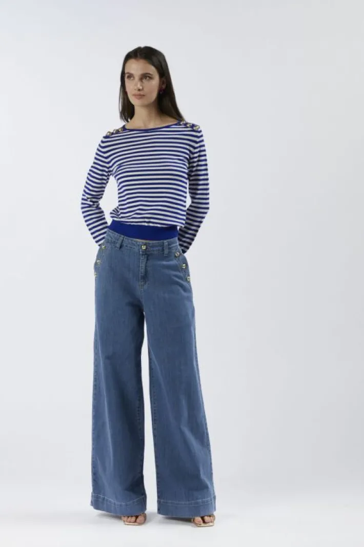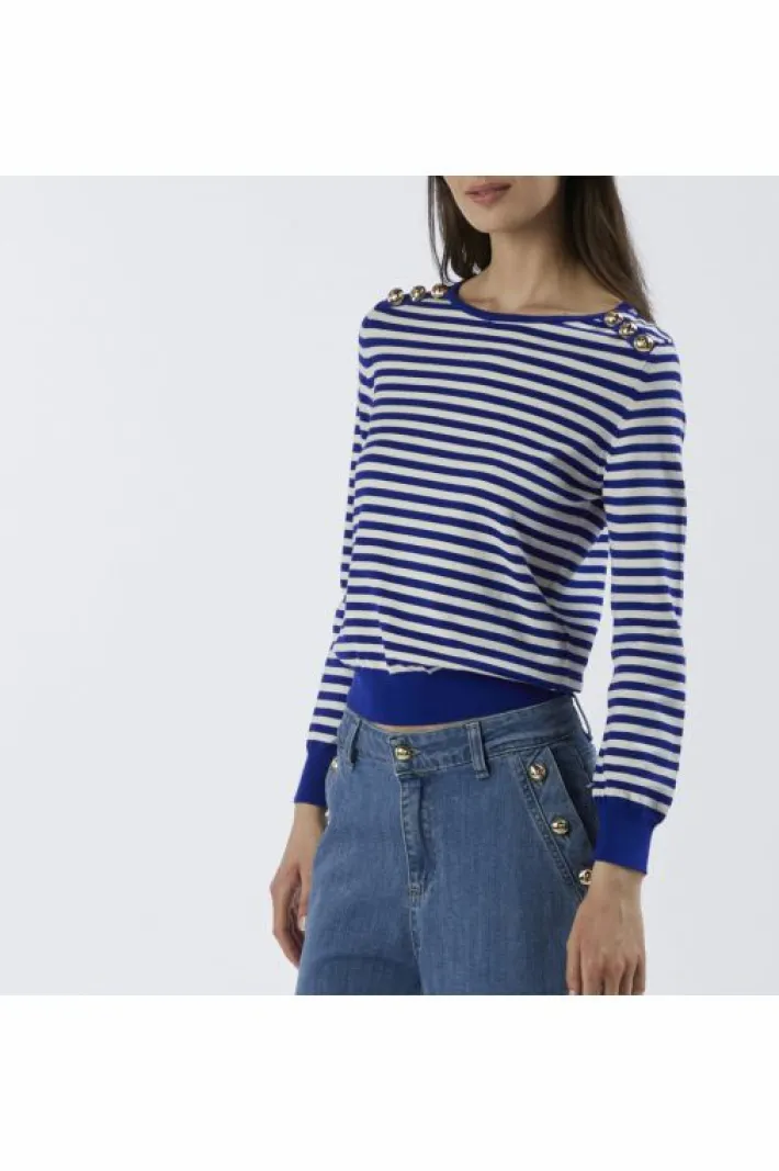 Maglia girocollo a righe con maniche lunghe e motivo di bottoni metallici dorati sulle spalle. maglia realizzata in filato misto viscosa.