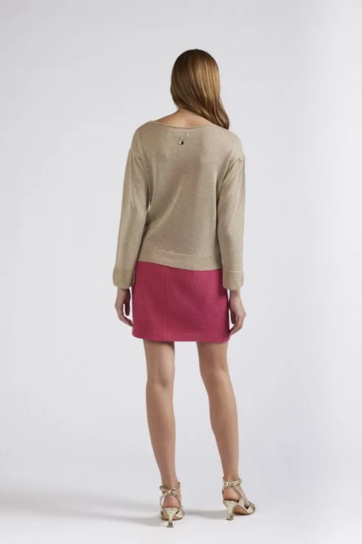 Maglia con scollo a barca e maniche lunghe. realizzata in filato misto viscosa con lurex.