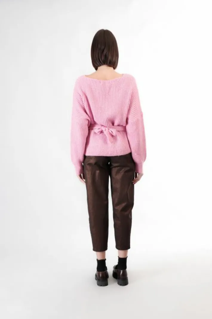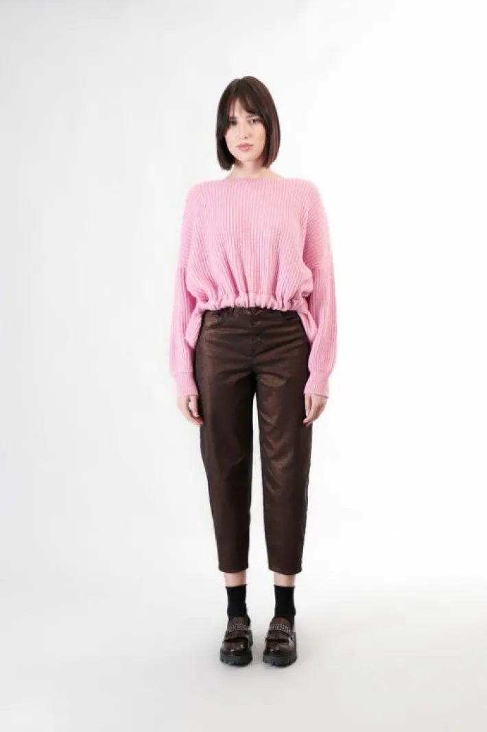 Maglia con collo a barca in filato mistolana con lavorazione moulinè. davanti coulisse sul fondo che crea gioco di vo…