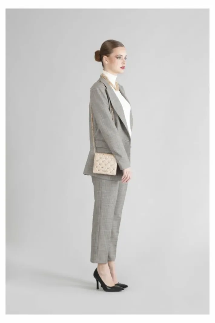 Mini bag glitterata con borchie esagonali. tracolla con catena. doppio scomparto e taschino interno. chiusura a calamita.