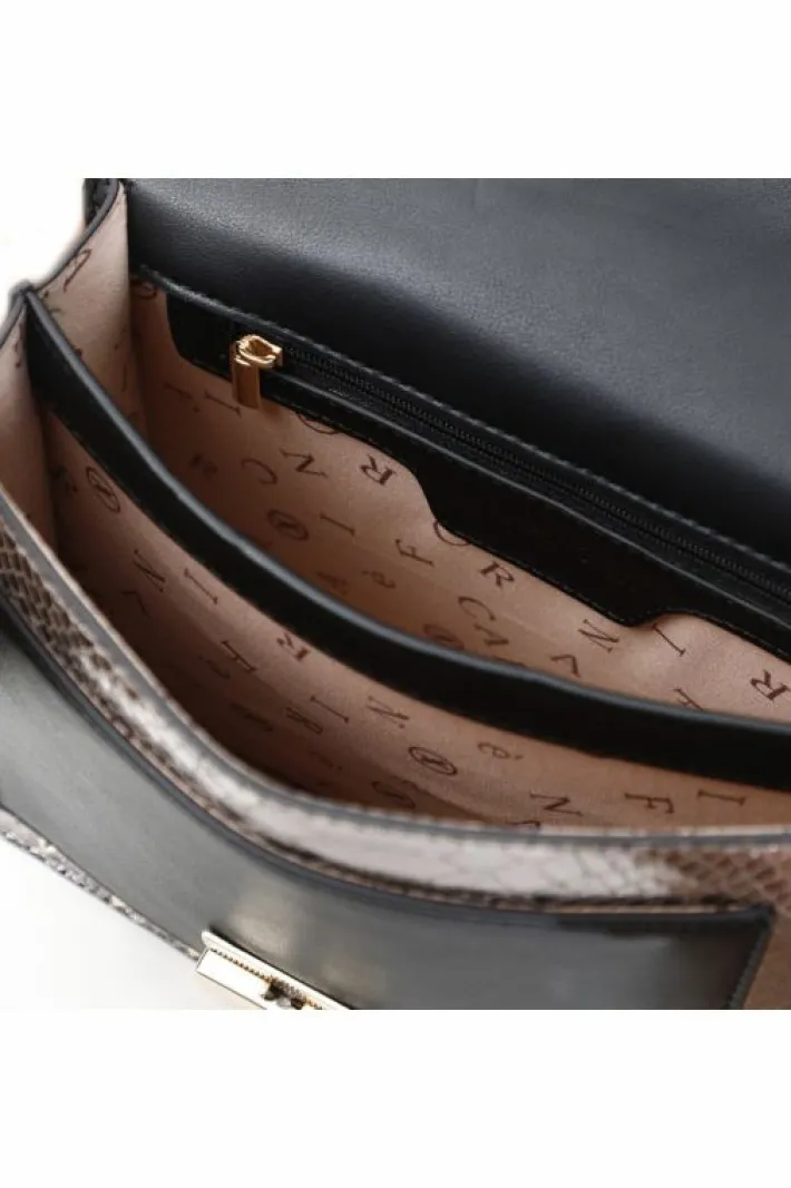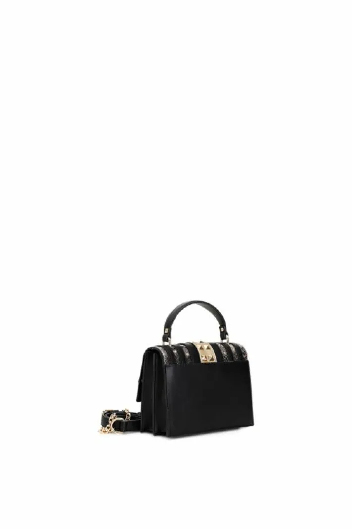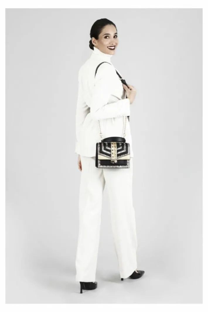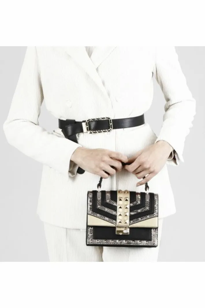 Minibag con riporti laminati e riporti stampa pitone laminato, arricchiti da file di borchie a piramide e strass.