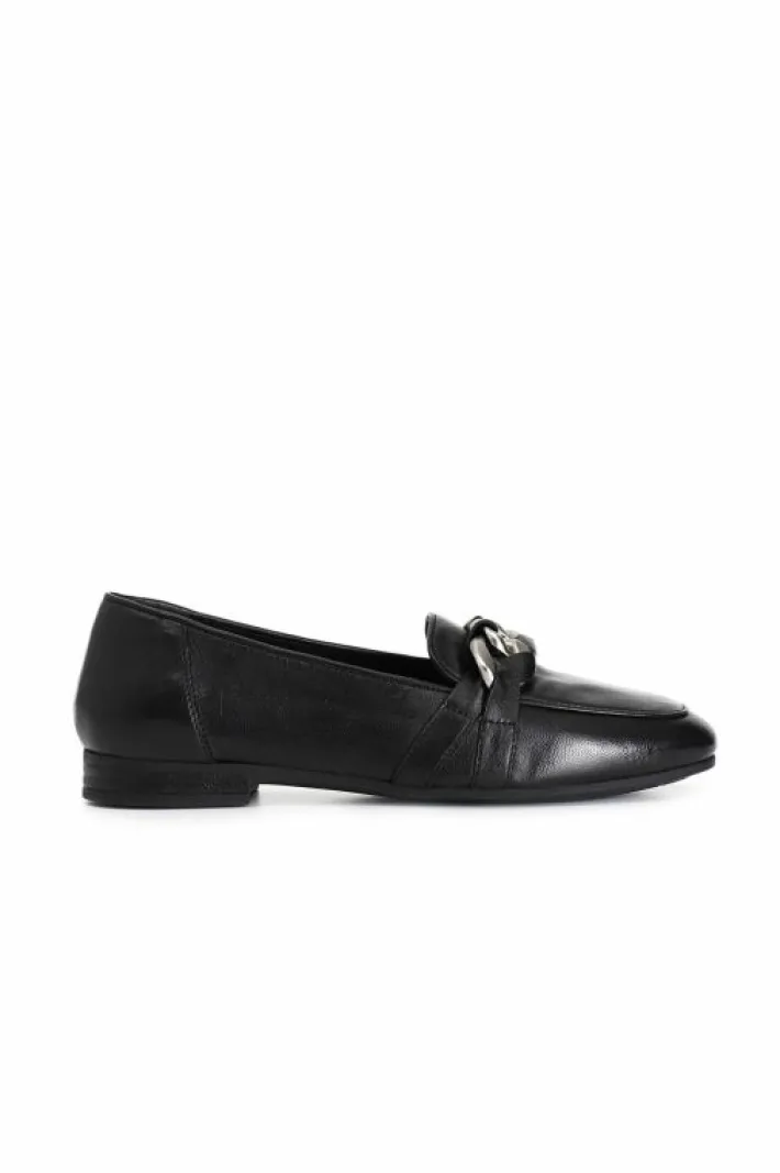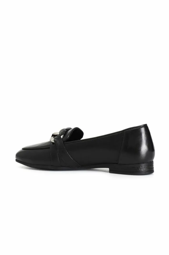 Mocassini donna in pelle arricchiti da una catena. il soletto è in pelle. tacco alto 15mm. modello versatile e dinamico ideale per completare moltissimi outfit.