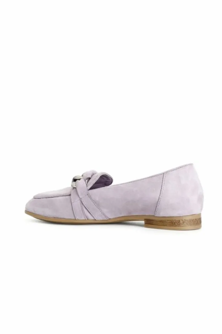 Mocassini donna in pelle scamosciata arricchiti da un morsetto a catena. il soletto è in pelle. tacco alto 15mm. modello versatile e dinamico ideale per completare moltissimi outfit.