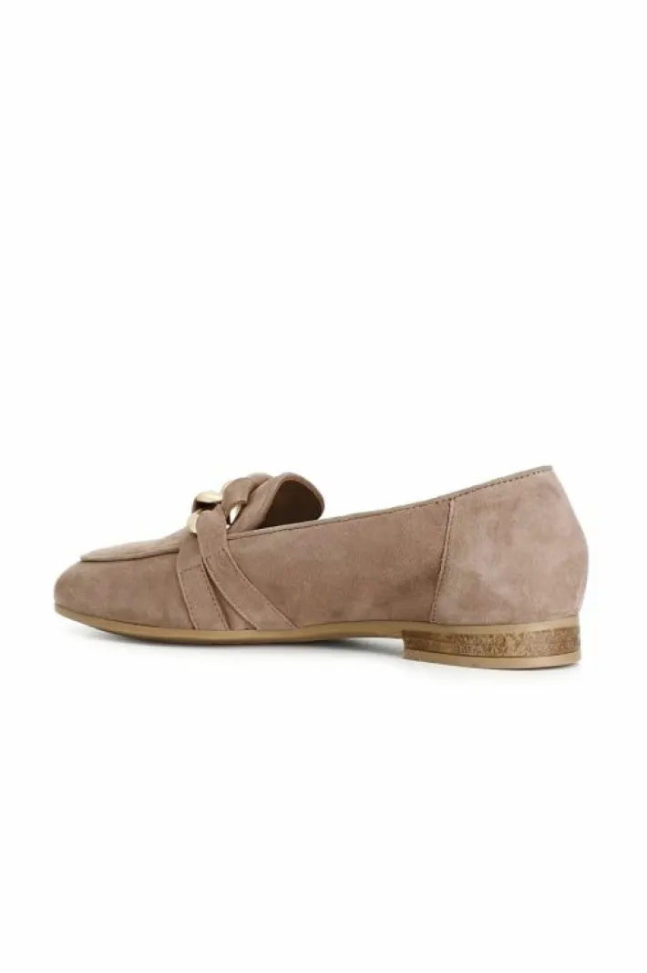 Mocassini donna in pelle scamosciata arricchiti da un morsetto a catena. il soletto è in pelle. tacco alto 15mm. modello versatile e dinamico ideale per completare moltissimi outfit.