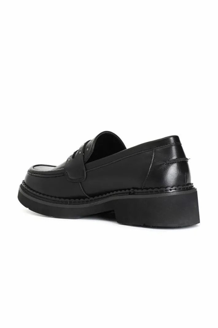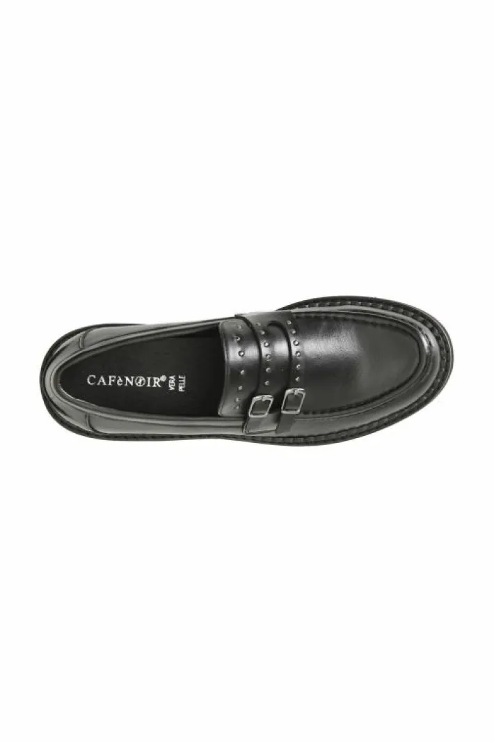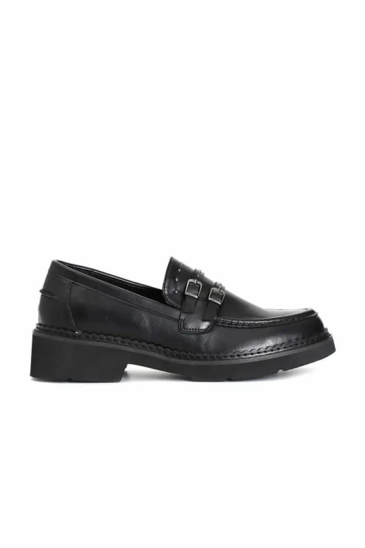 Mocassino da donna in similpelle con doppia fibbia e microborchie cromate applicate. il soletto è in pelle.